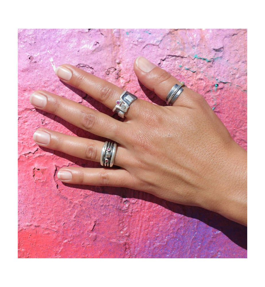 Nous aimons le contraste entre les rubis et le diamant brut qui ornent cette bague en argent 925 réalisée dans les ateliers de notre partenaire créatrice polonaise. Le diamant, brut, s'harmonise parfaitement au design à tendance ethnique, tandis que les rubis apportent une subtile touche d'élégance à la bague. Trois rainures (dont le fond est oxydé) agrémentent l'anneau et une des deux bordures de la bague présente des aspérités irrégulières, oxydées ou non. La seconde bordure est vaguement et finement striée, il ne s'agit bien sûr pas d'un défaut mais d'un esprit très moderne. largeur anneau dessous 0.75 dessus 1.2 - ép dessous 1.2, bordure dessus 2 mm