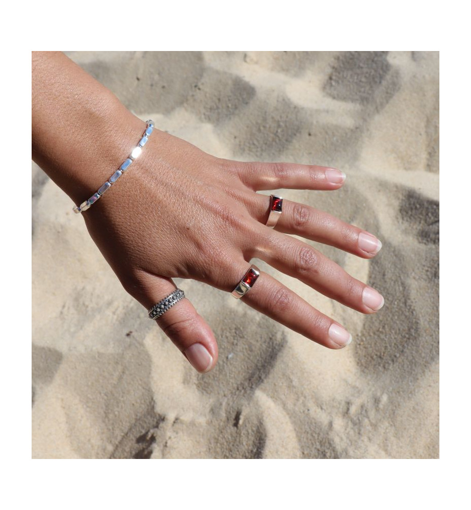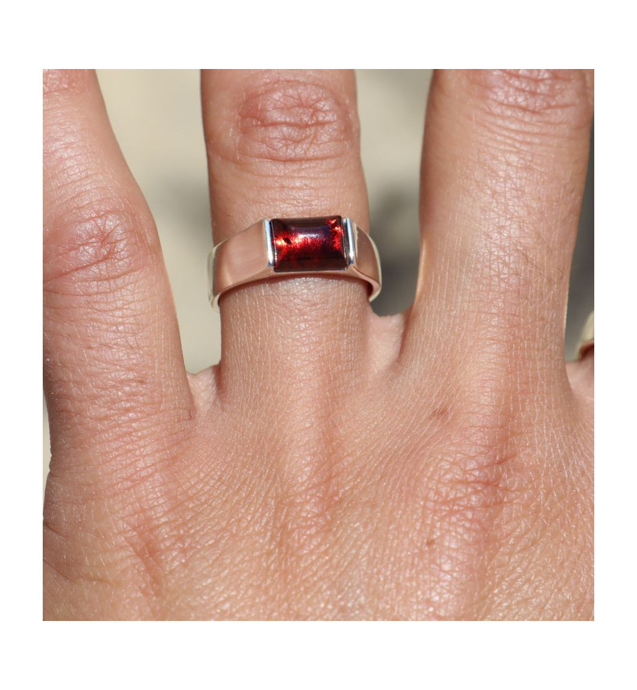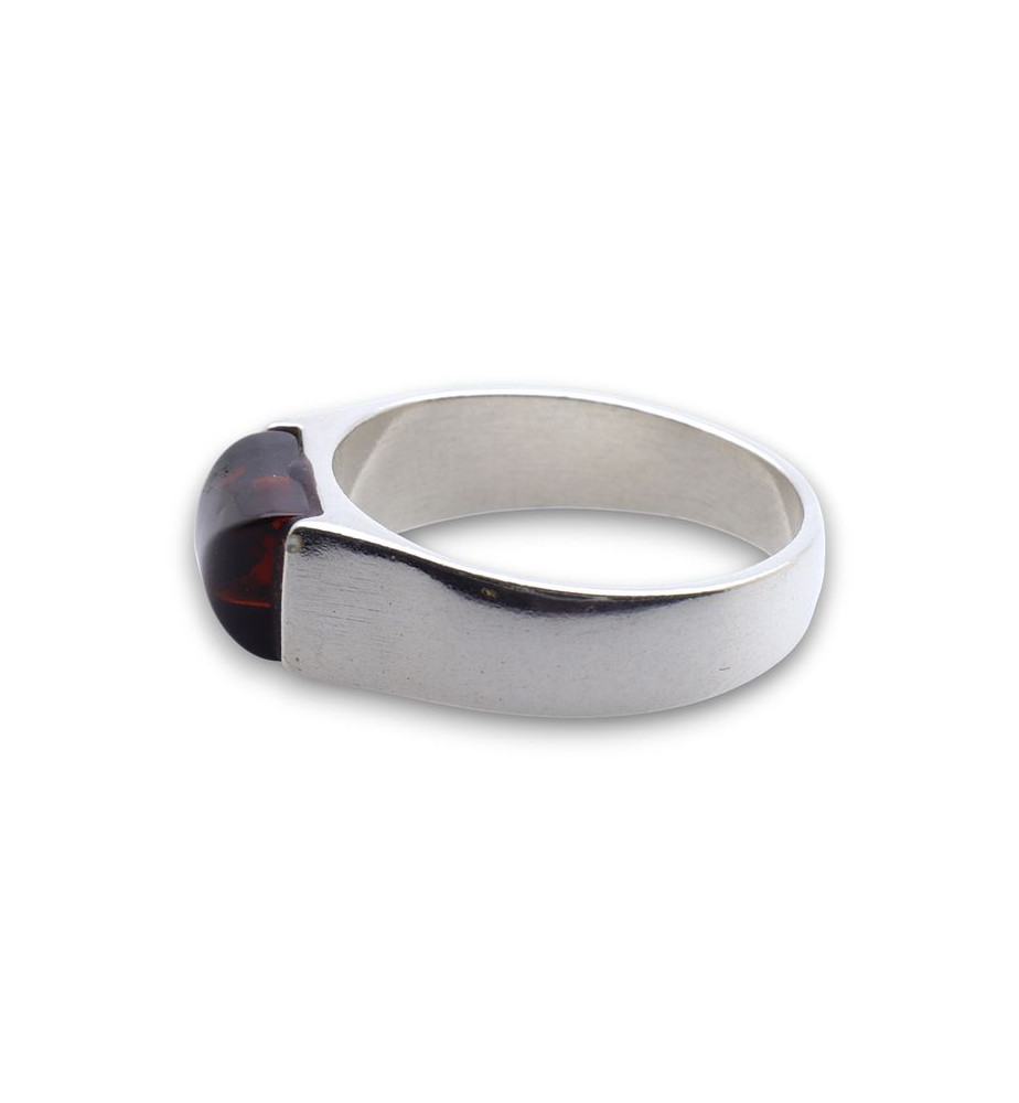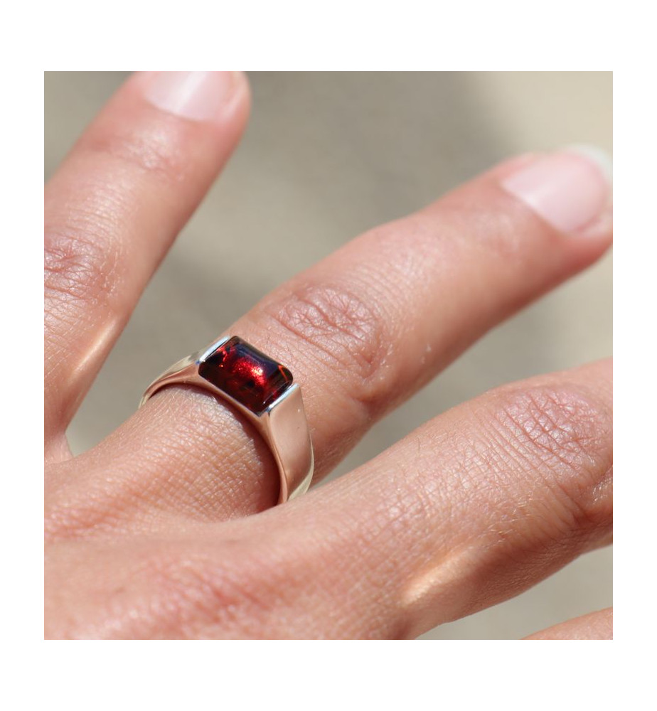Cette bague en argent 925 et ambre rouge a une forme parfaite pour être portée sur le petit doigt mais aussi sur les autres bien sûr. L'ambre cerise est placé sur un plateau argent, ce qui donne un effet de brillance très particulier dans la lumière grâce à la translucidité de la gemme organique. L'ambre mesure 6 x 9 mm.