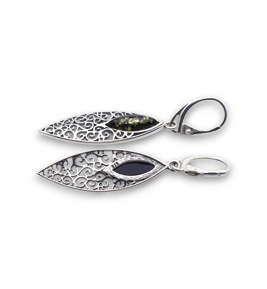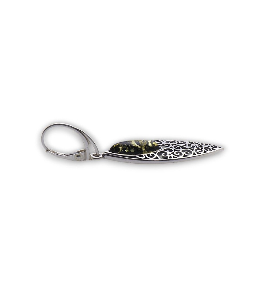Boucles d'oreilles argent et ambre vert avec motif ajouré