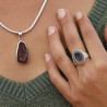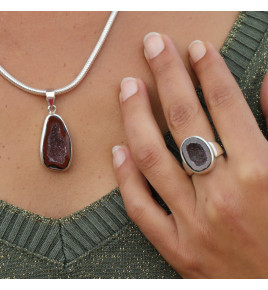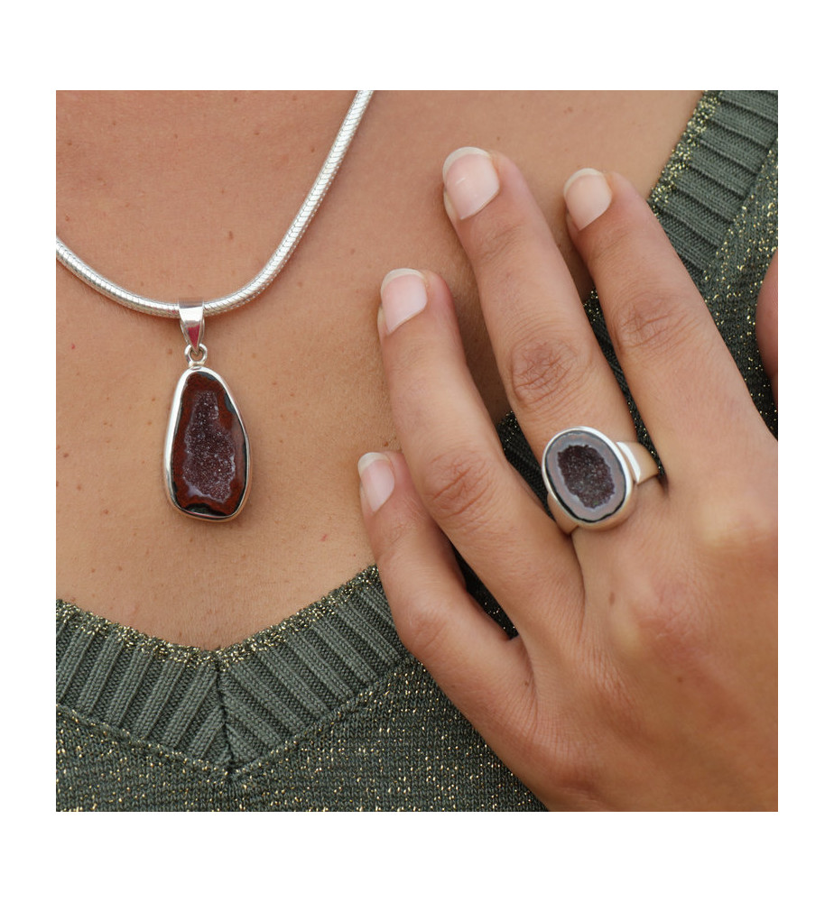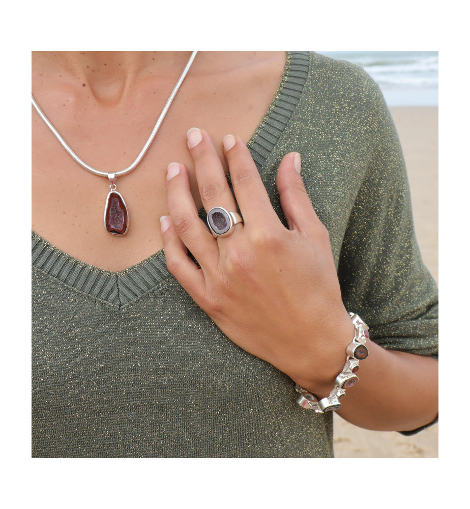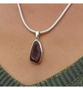 Passionnées des pierres naturelles laissez-vous emporter par le mystère et le charme de ce pendentif en argent 925 empierré d'une géode Tabasco fascinante. Hélas nous n'avions pas de soleil le jour où nous l'avons photographié sur la plage, nous ne pouvons donc pas voir ses micro-cristaux scintiller, cela vous réservera une belle surprise le jour où vous le découvrirez dans les rayons du soleil. Le cristal est poli sur les pourtours tandis que la cavité est entièrement naturelle. Cette dernière revêt des tons pourpres et le pourtour est dans le rouge-bordeaux, avec quelques touches de vert foncé. La monture est épurée et moderne. Nous vous conseillons de le porter plutôt avec des couleurs claires.