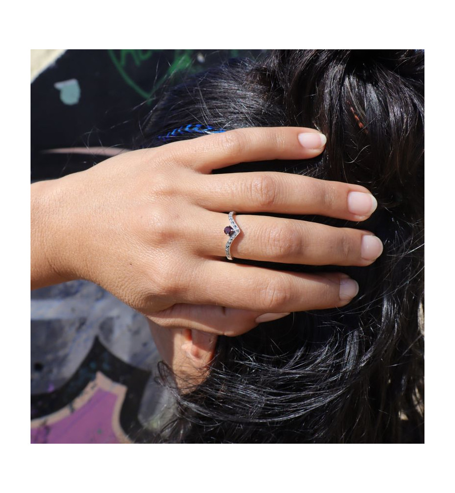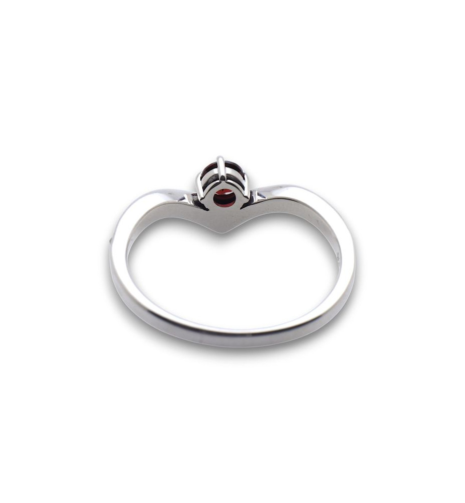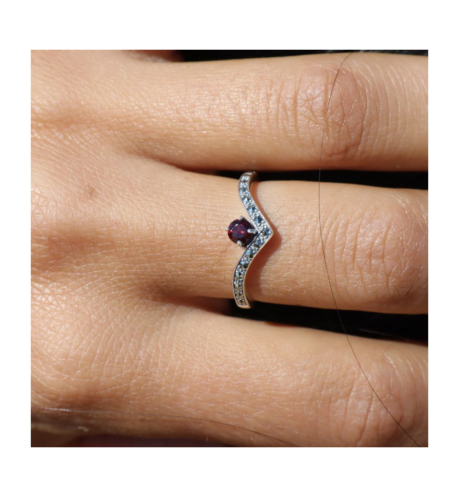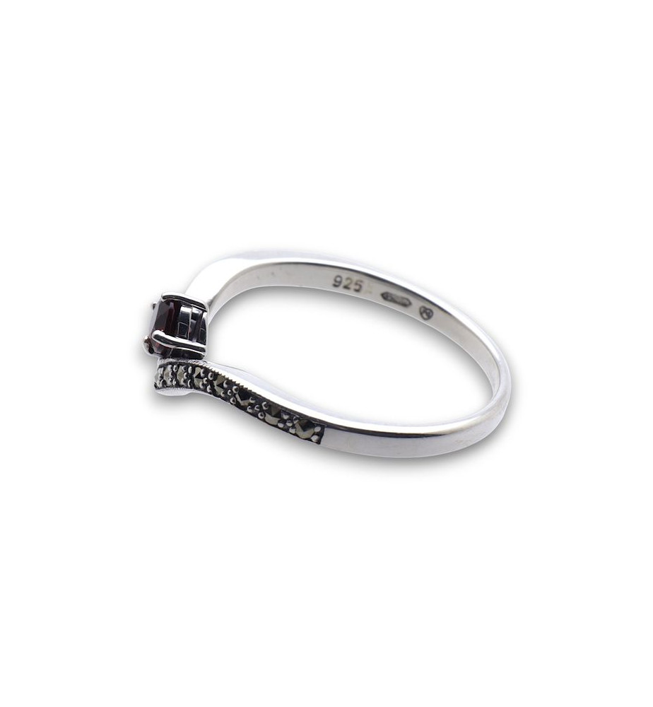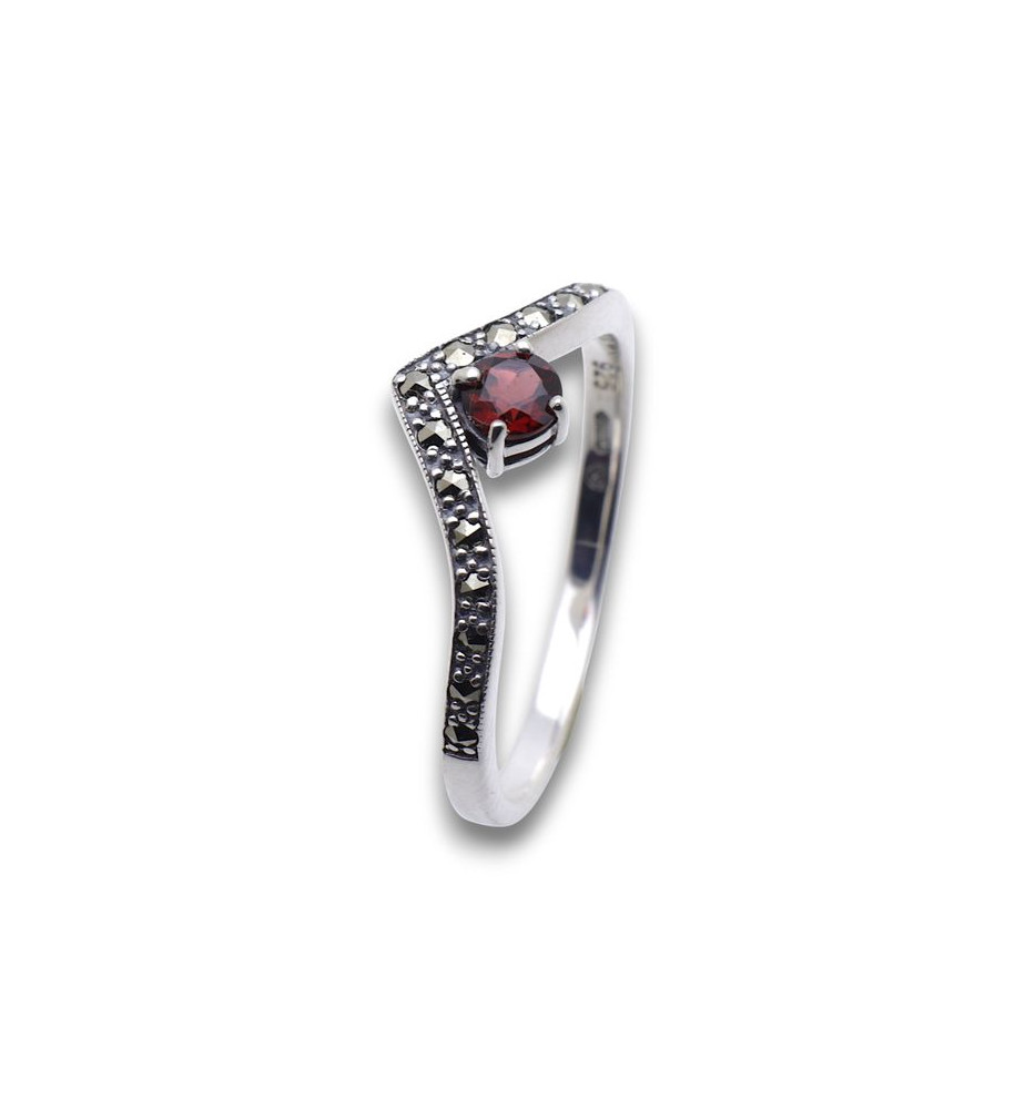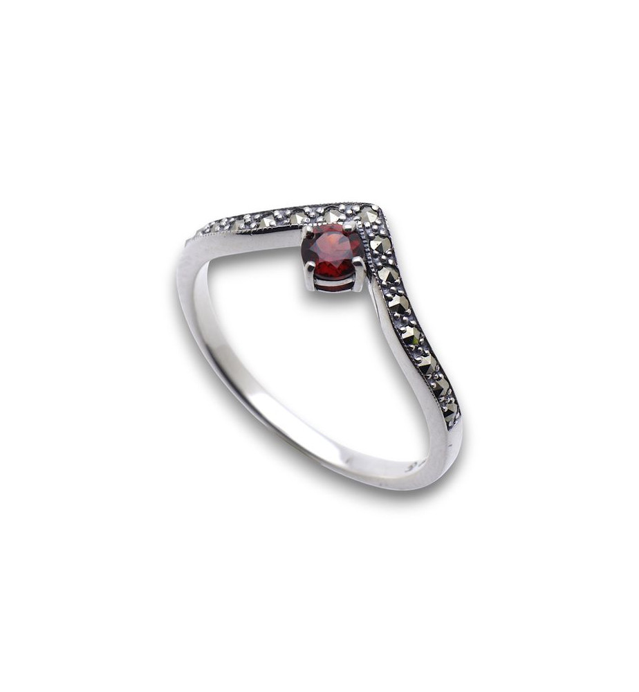 Si vous êtes à la recherche d'une bague de fiançailles ou tout simplement d'une bague délicate, ce modèle est parfait. En effet cette bague en argent 925, sertie d'un grenat rond et facetté et de marcassites disposées de chaque côté de l'anneau, est fine, élégante et originale dans sa forme. Elle a tout pour plaire à celles qui aiment les bagues fines et elle est très raffinée. Comme pour toutes les bagues serties de marcassites il est préférable de l'enlever pour se laver les mains car ce cristal n'aime pas l'eau.