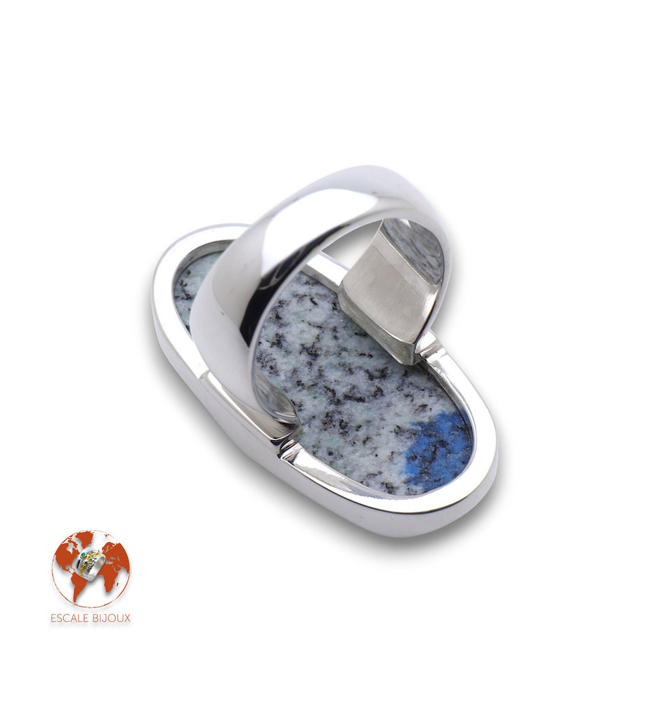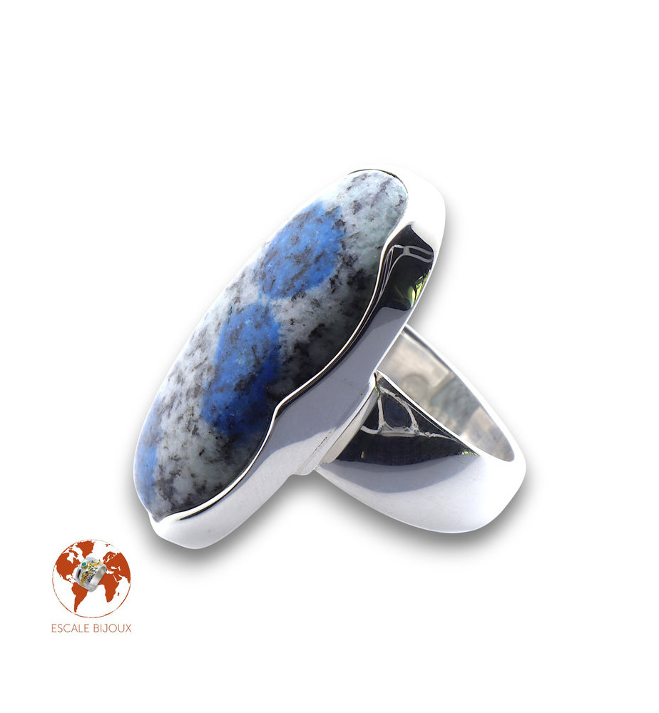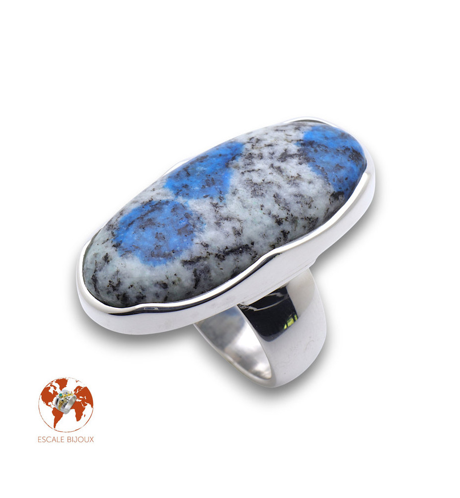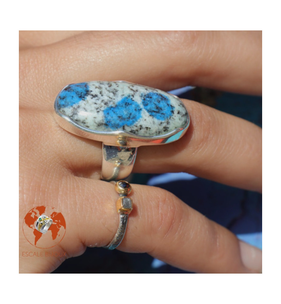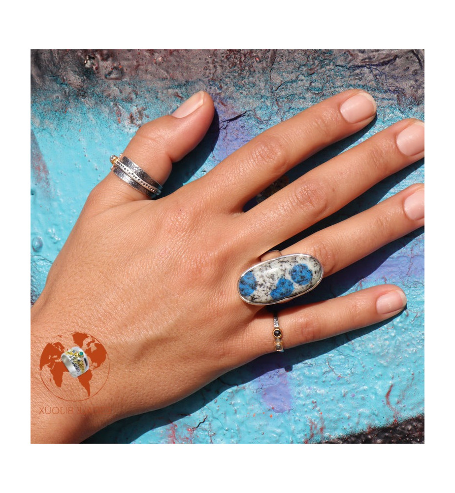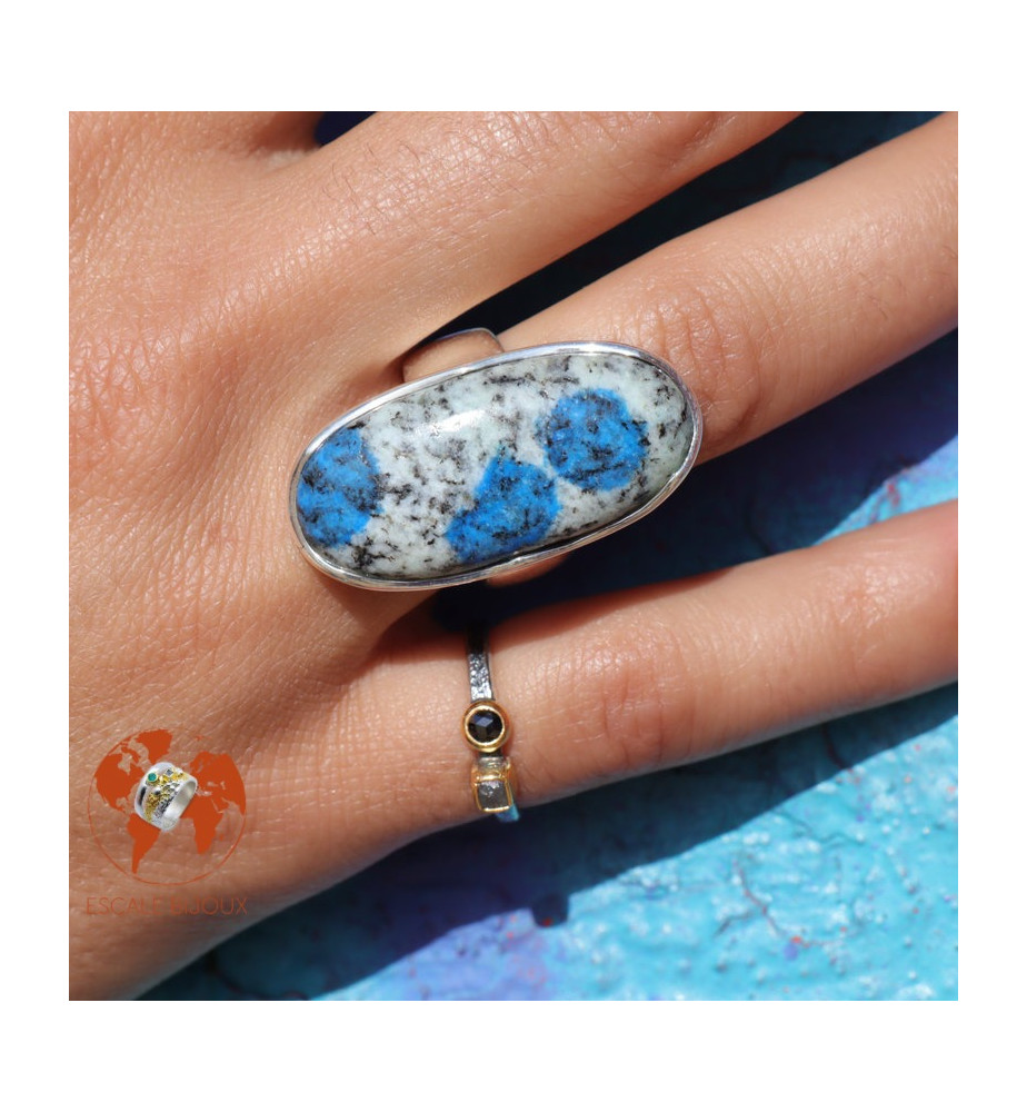 Allongez votre main en choisissant cette longue bague en argent 925 agrémentée d'une belle pierre gemme, un jaspe K2, cristal que l'on trouve au pied du K2, 2ème plus haute montagne du monde située dans l'Himalaya (à cheval entre le Pakistan et la Chine). Trois taches de bleu attirent irrésistiblement le regard et la monture en courbes apporte de la fantaisie à la bague. Elle mesure 3.4 x 1.7 cm.