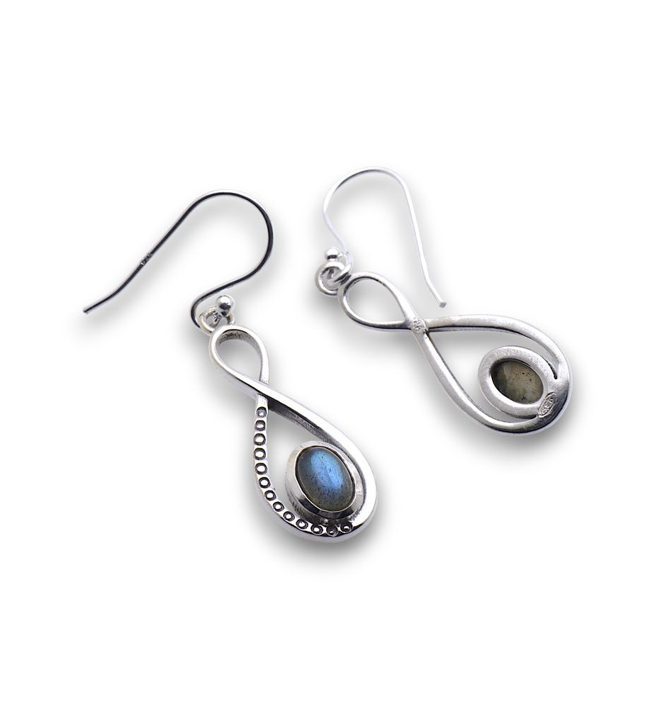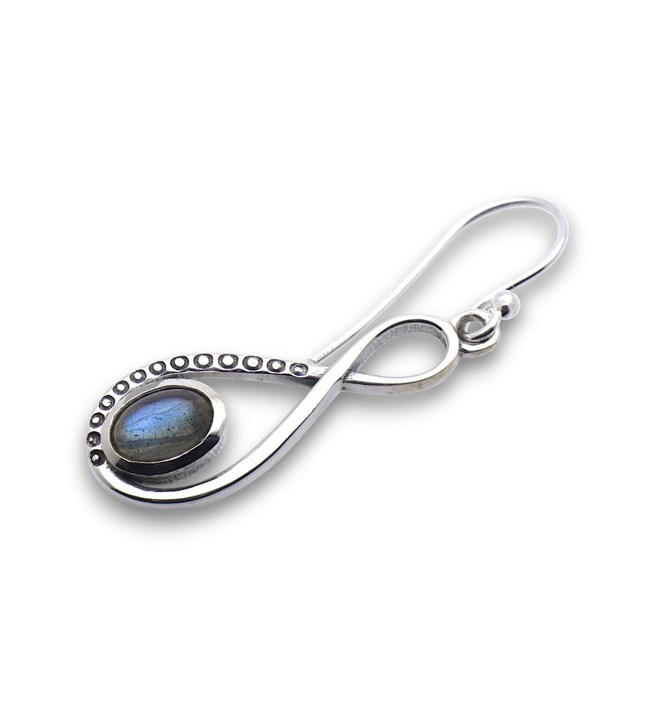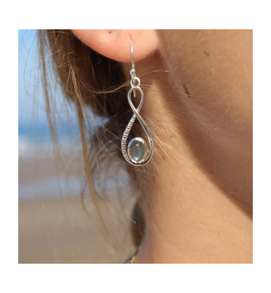 Légères et agréables à porter, ces boucles d'oreilles en argent 925 et labradorite apporteront une discrète touche de couleur à votre visage. Elles représentent le symbole de l'infini et les pierres gemmes sont placées en bas du motif. Elles seront livrées avec des embouts en silicone qui bloquent les crochets.
