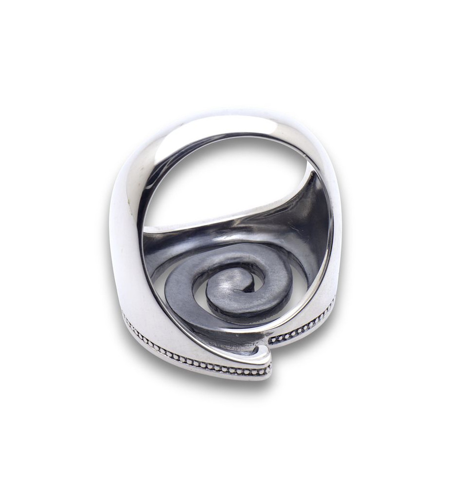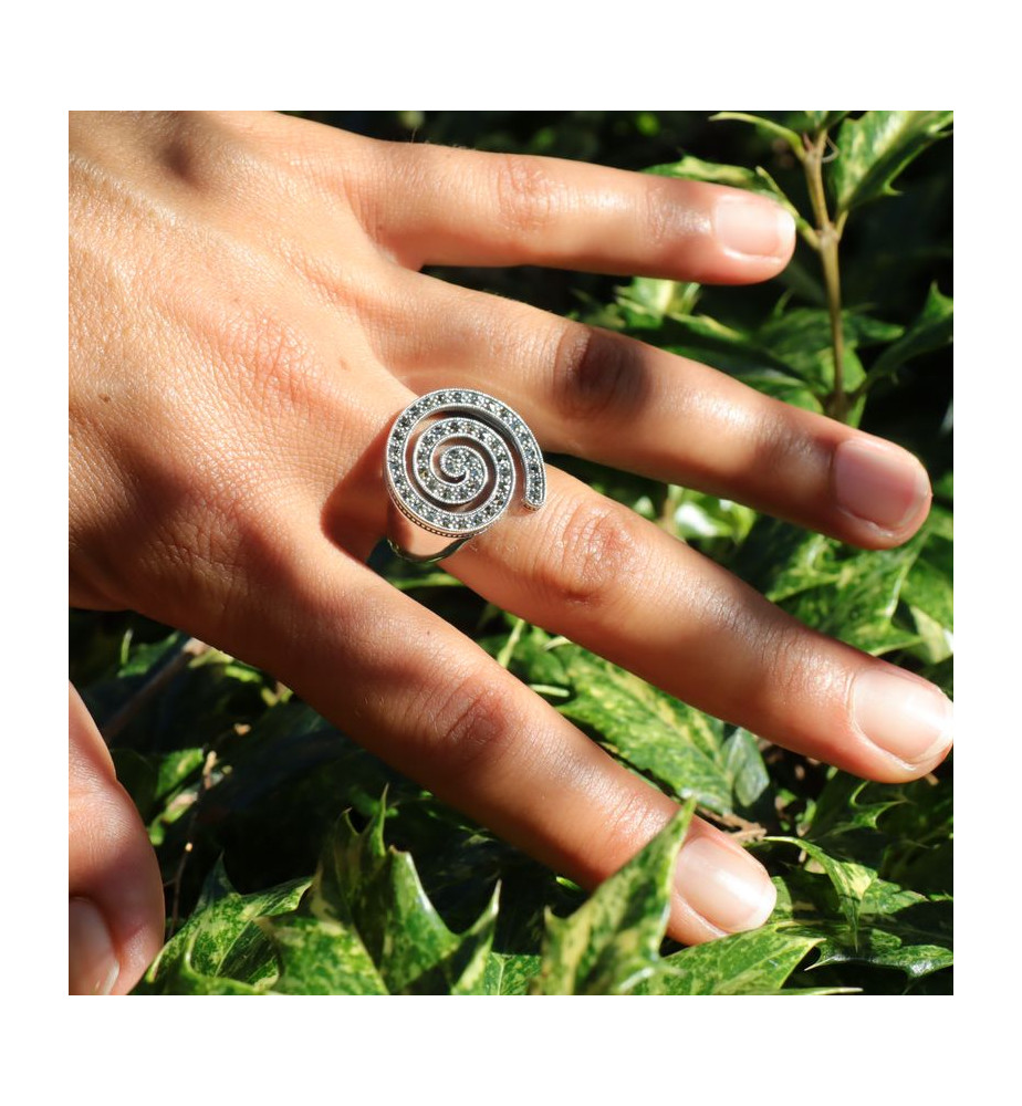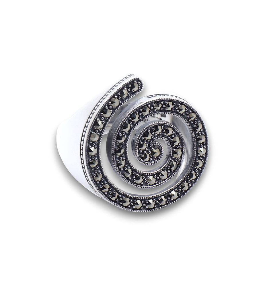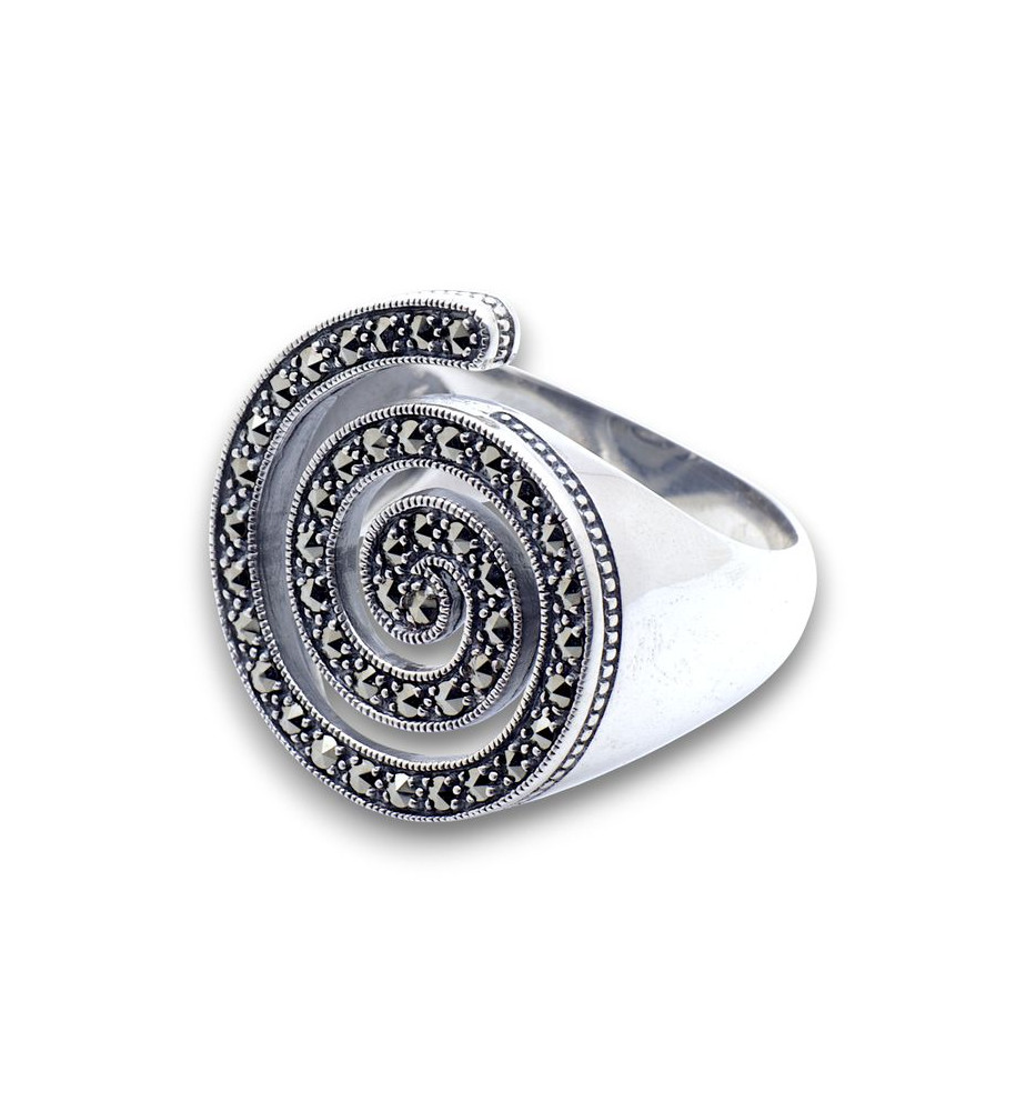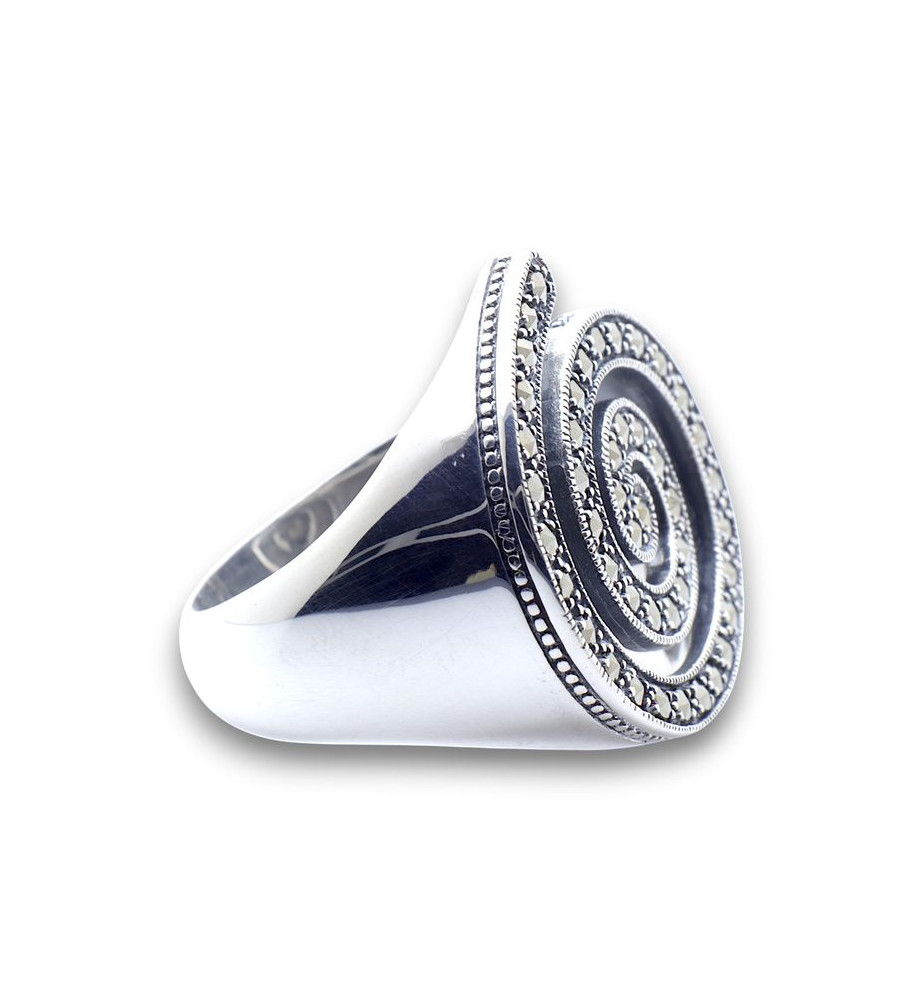 Pour un soir de fête ou pour le plaisir de porter un bijou hors du commun, cette magnifique bague en argent 925 sertie de nombreuses marcassites qui font scintiller le motif spiralé vous comblera. Une rangée (placée sous la spirale) de petits carrés arrondis gravés dans l'argent vient faire écho aux marcassites. La bague mesure 2.2 x 2.1 cm.