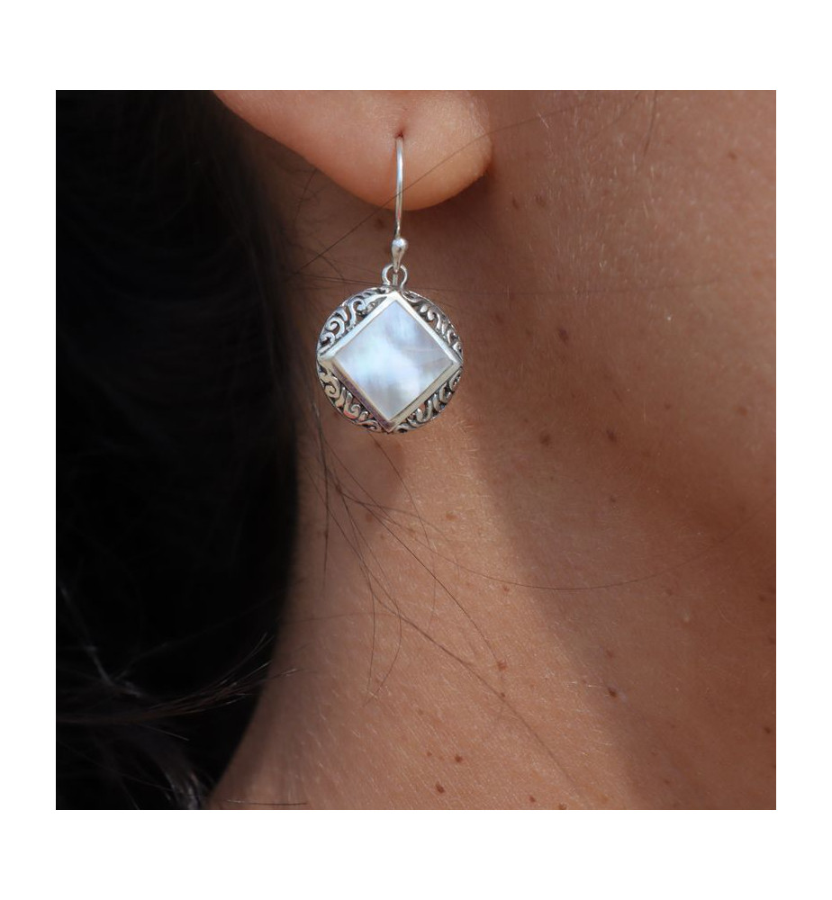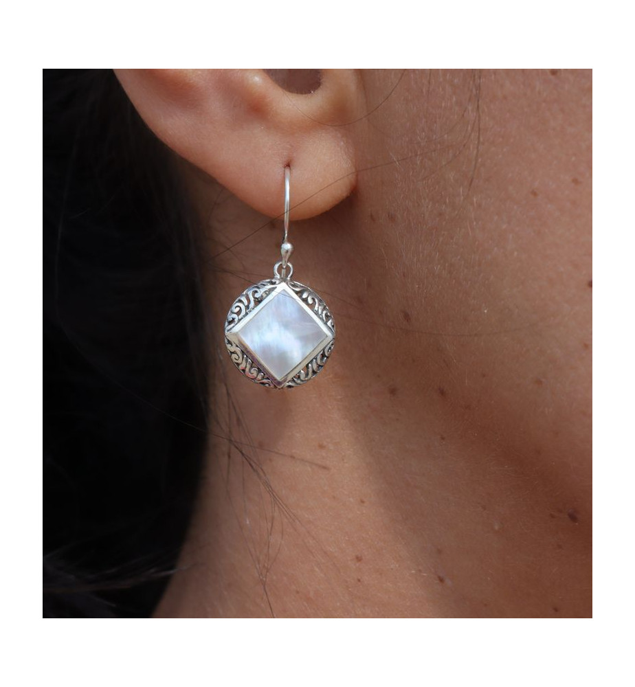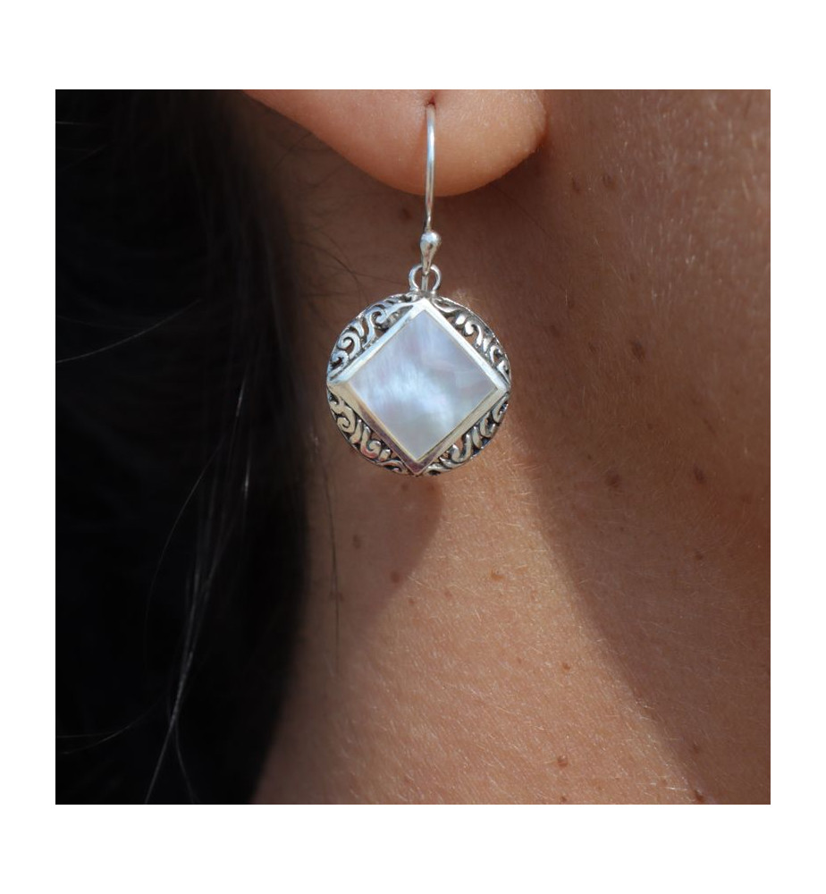 Nous sommes toujours dans cette nouvelle collection de boucles nacre fabriquées en Indonésie, il s'agit ici de boucles d'oreilles avec une nacre blanche placée au centre d'un motif en argent 925 ajouré. Ce motif est fait de volutes. Nous aimons la forme des boucles, le losange dans le cercle étant particulièrement joli. Nous fournissons bien sûr les embouts en silicone qui bloquent les crochets.