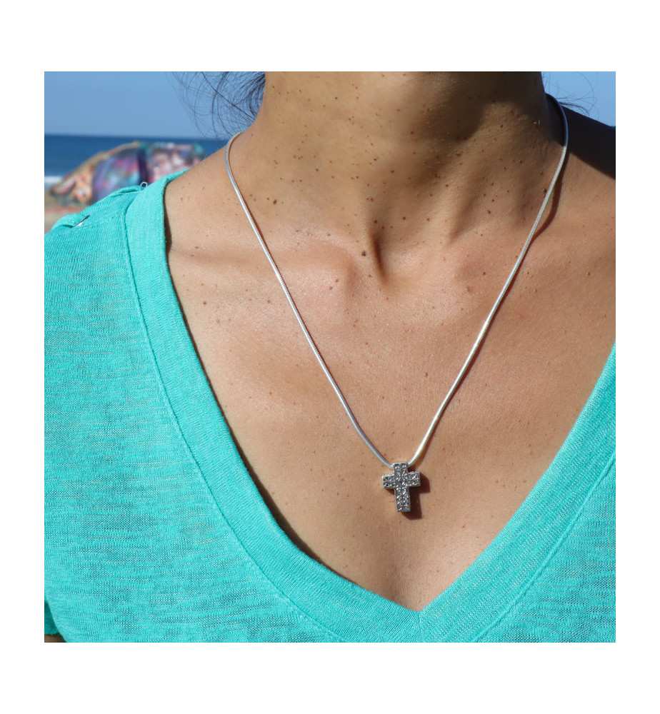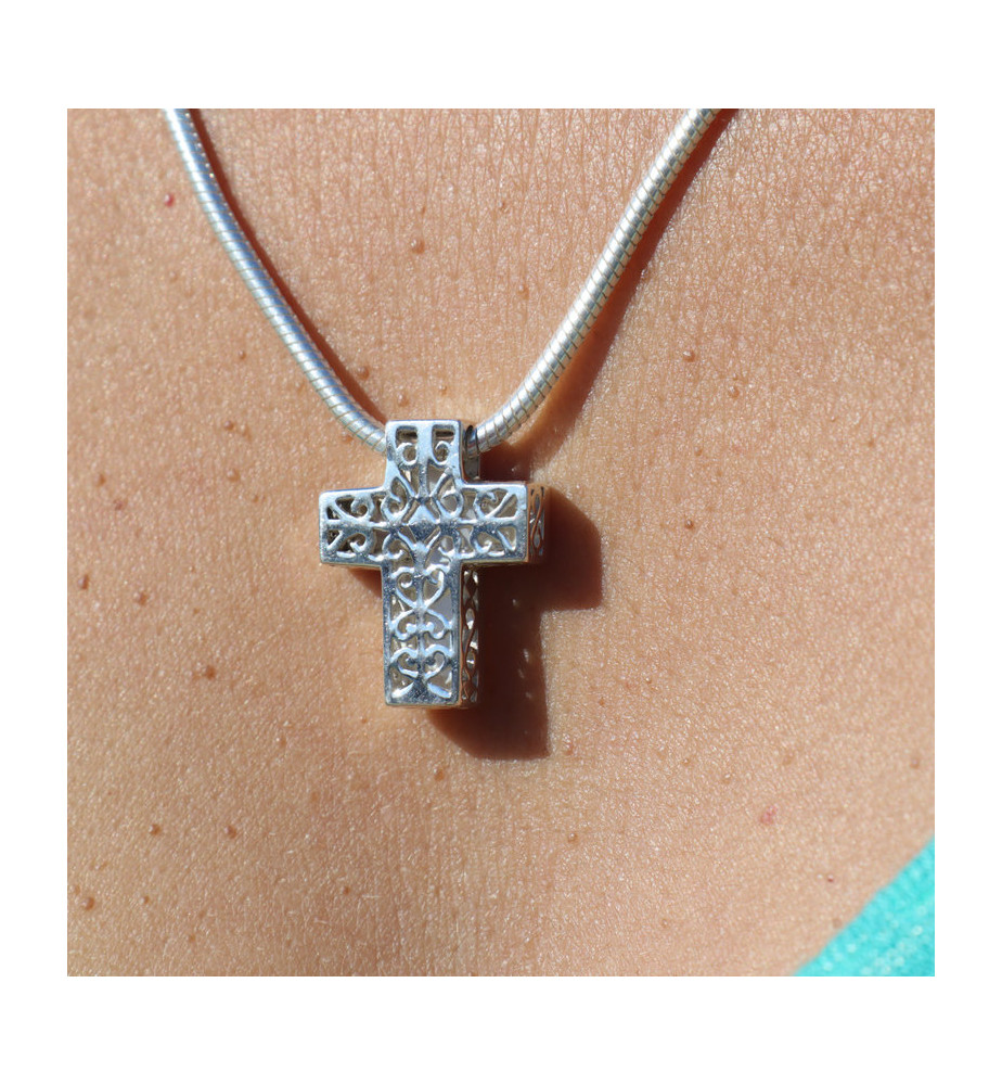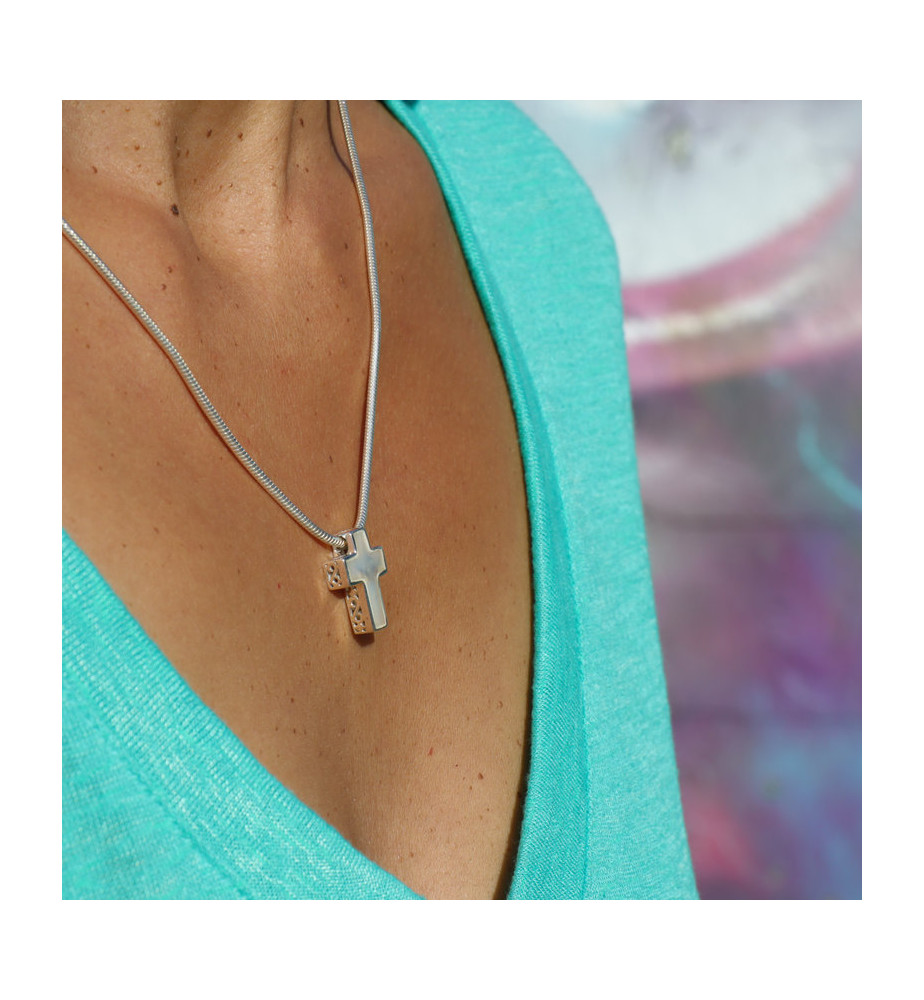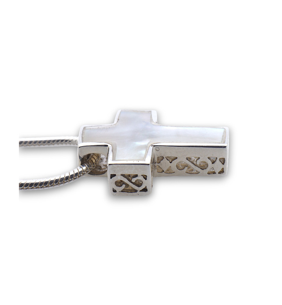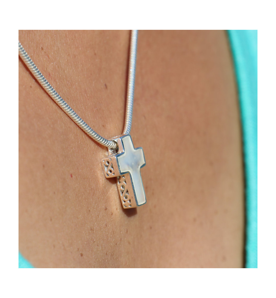 Pendentif croix argent et nacre blanche réversible