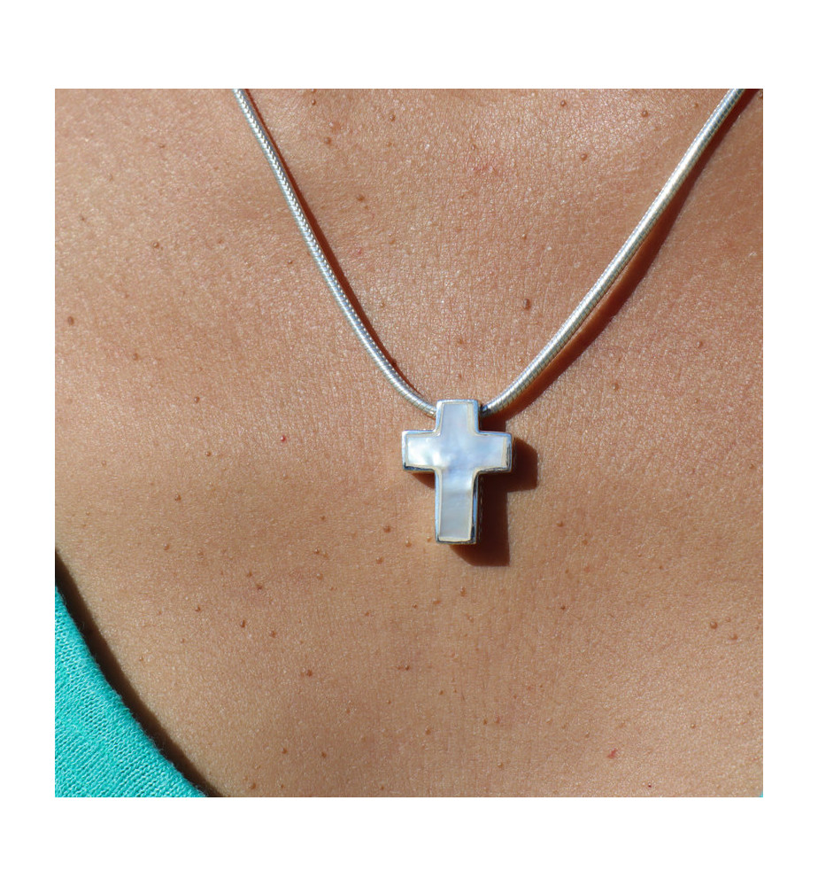 • nacre blanche pendentif argent croix femme