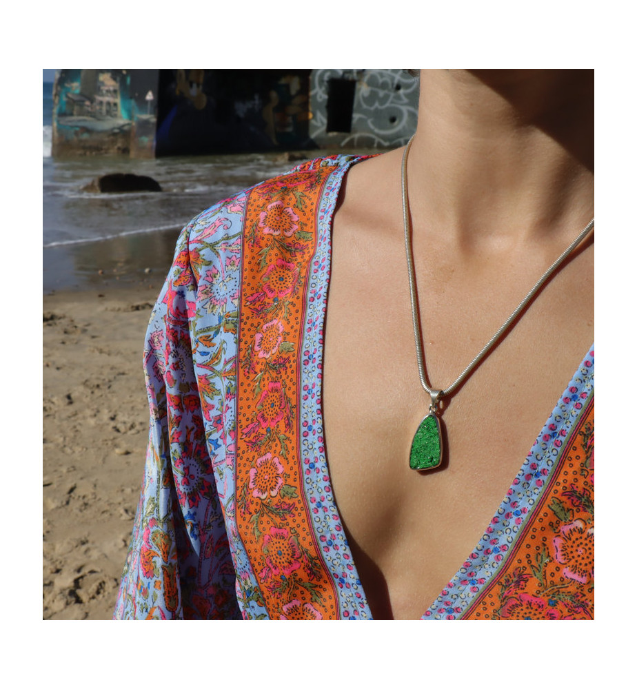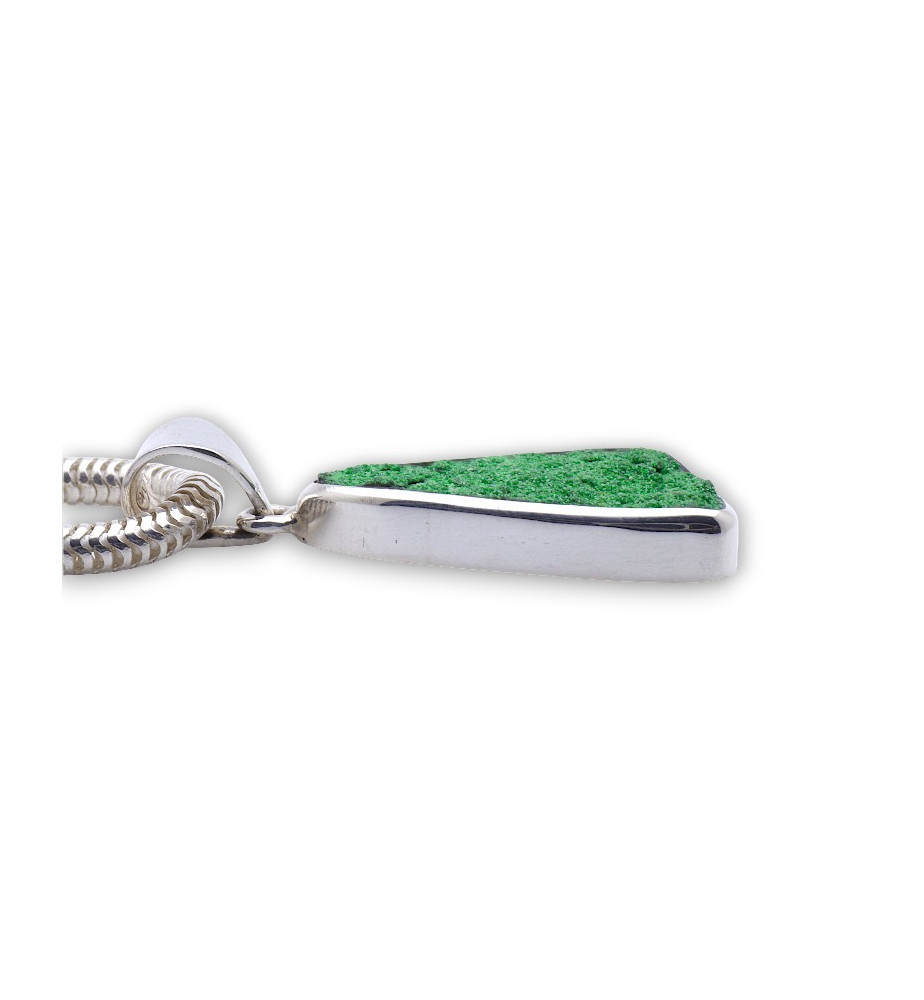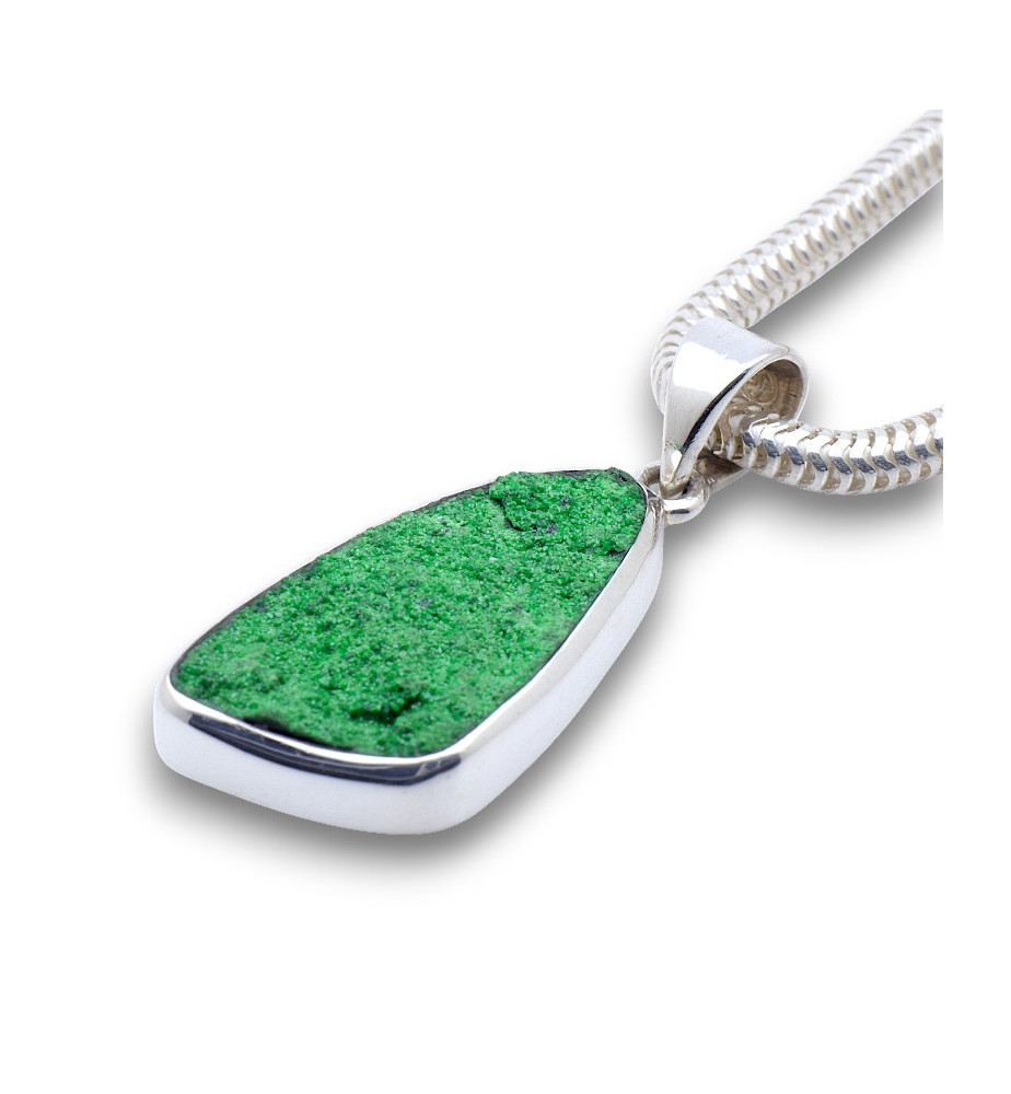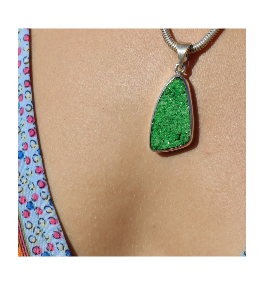 Un air de printemps vient agréablement à notre esprit quand on regarde ce pendentif en argent 925 serti d'une uvarovite. La pierre ornementale a été montée dans sa version naturelle, elle n'a pas été polie. On voit une fente tout en haut du cristal, cela fait partie du charme des pierres "brutes" et on la voit surtout sur les photos prises dans la boîte à lumière car l'objectif est intraitable, alors que sur les photos du pendentif porté on la devine à peine. La monture est épurée et blanche, conférant un style très contemporain au pendentif.