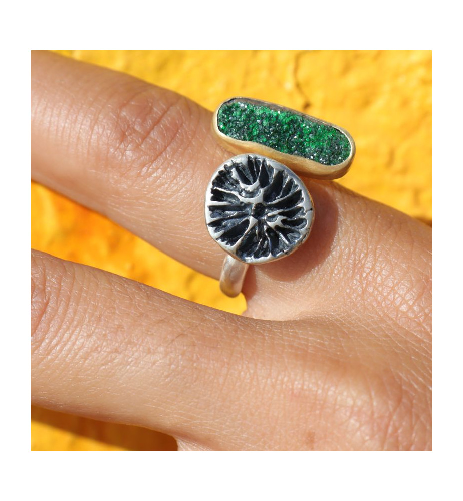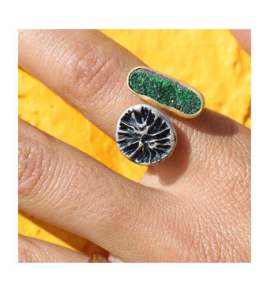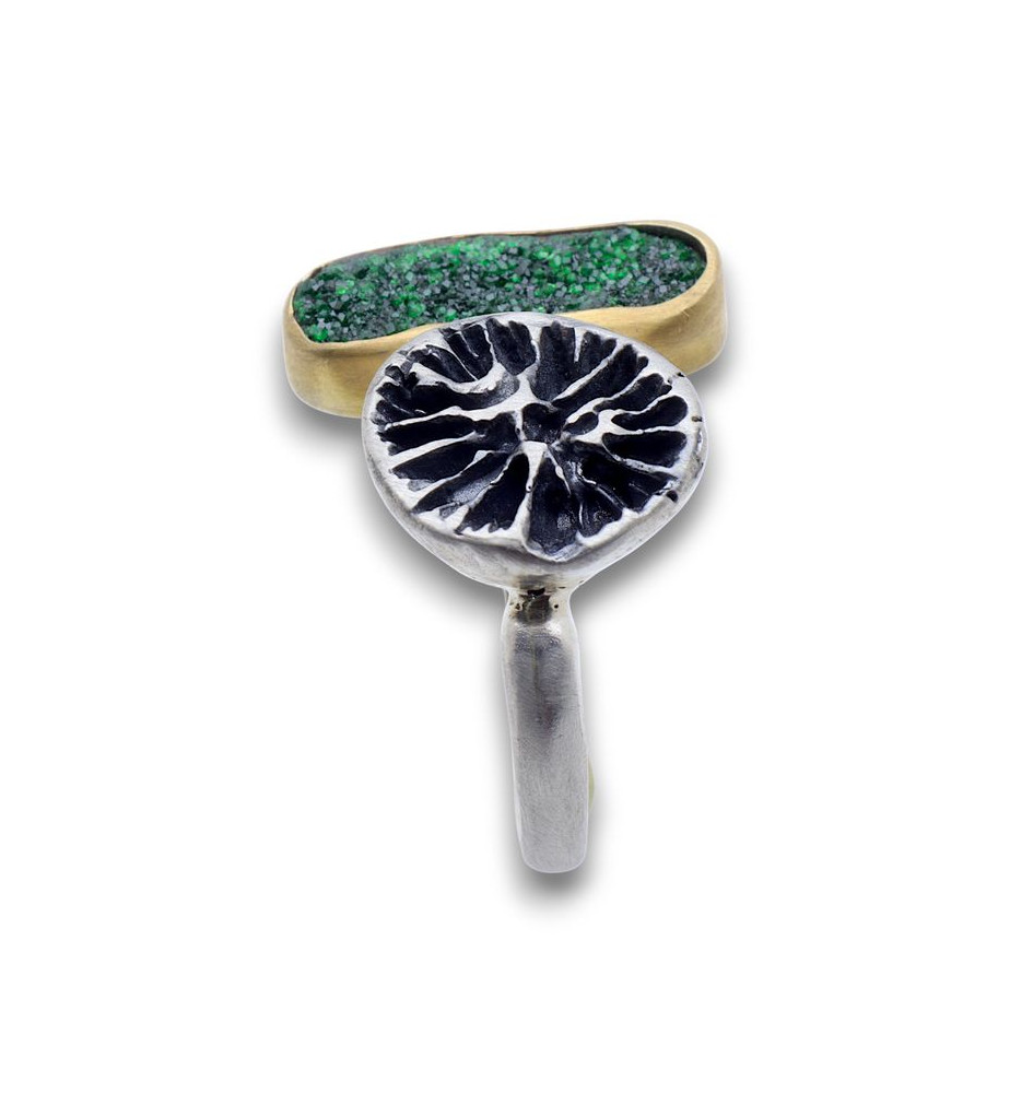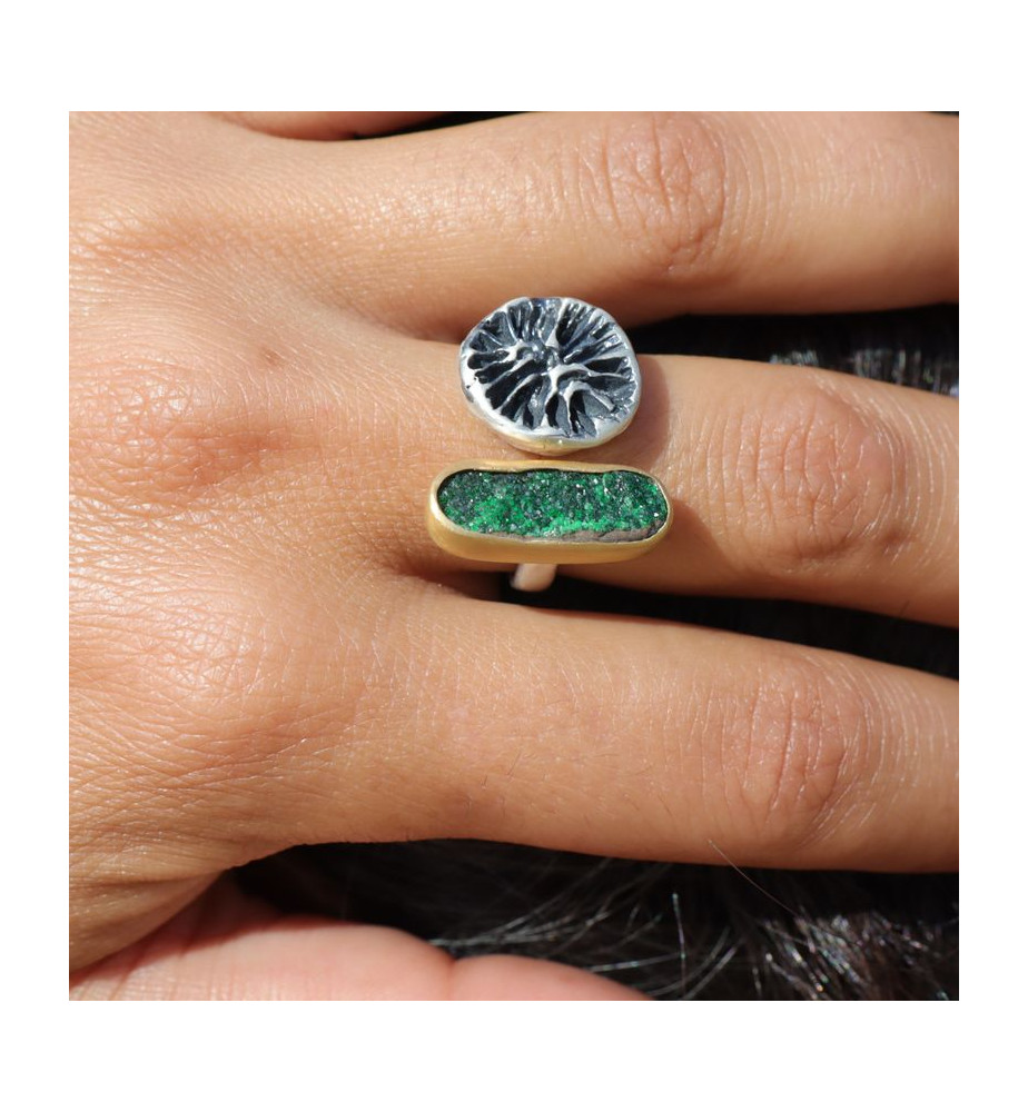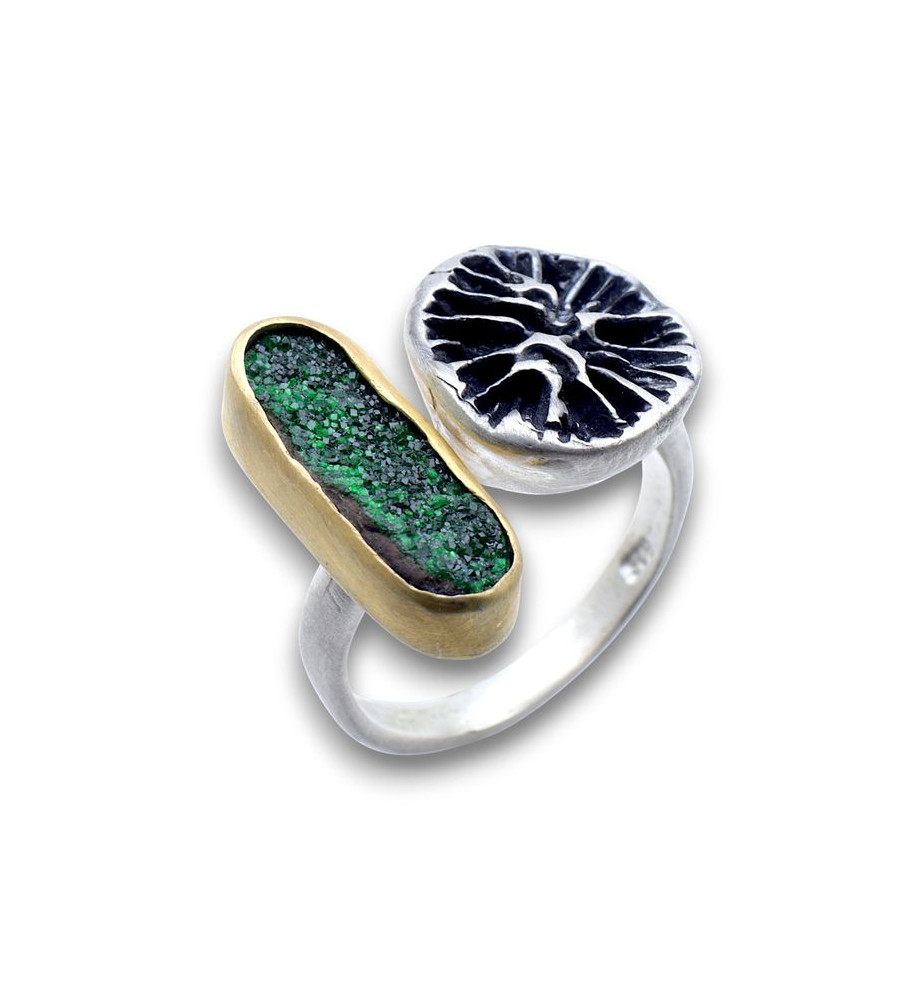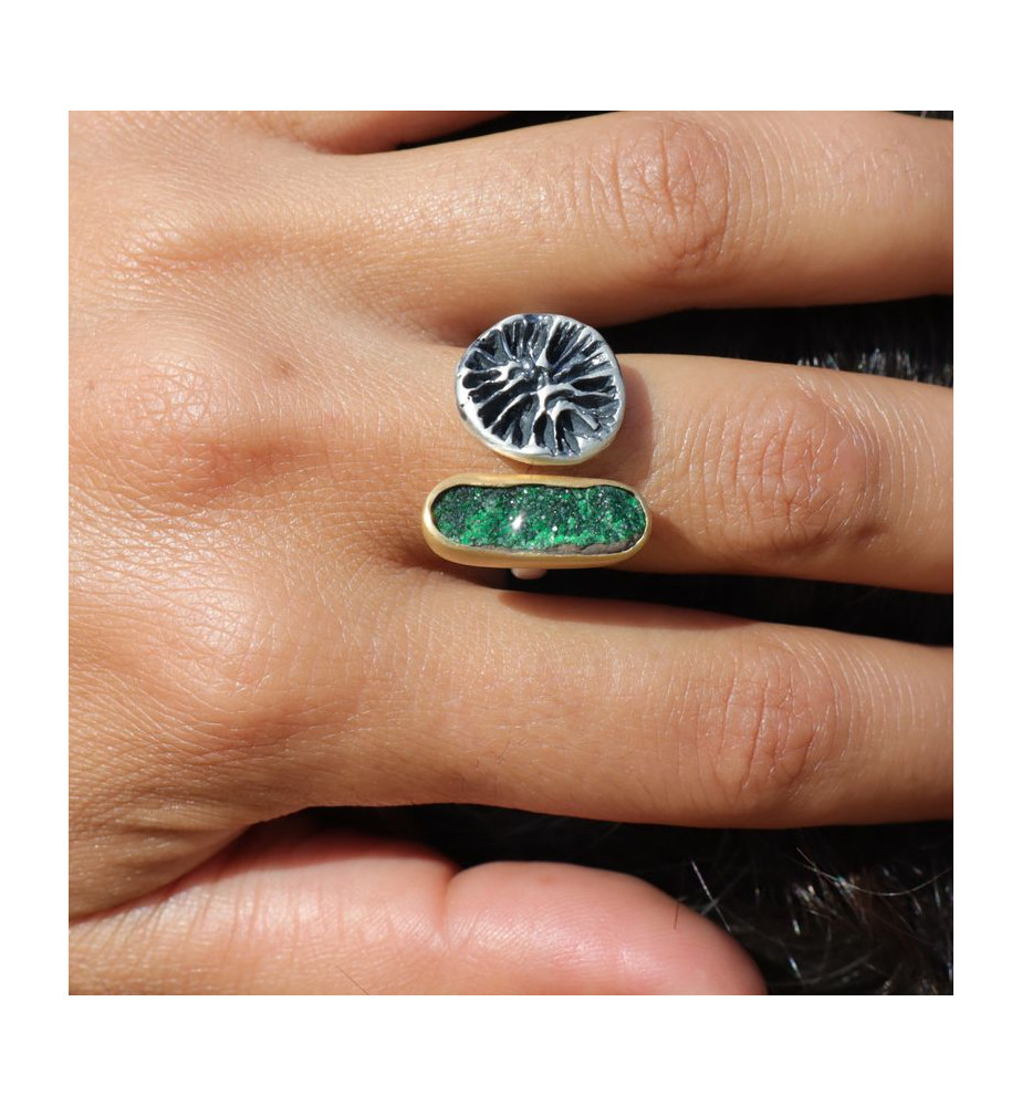 Bague en argent 925 avec motif fleur oxydée et uvarovite - Pologne