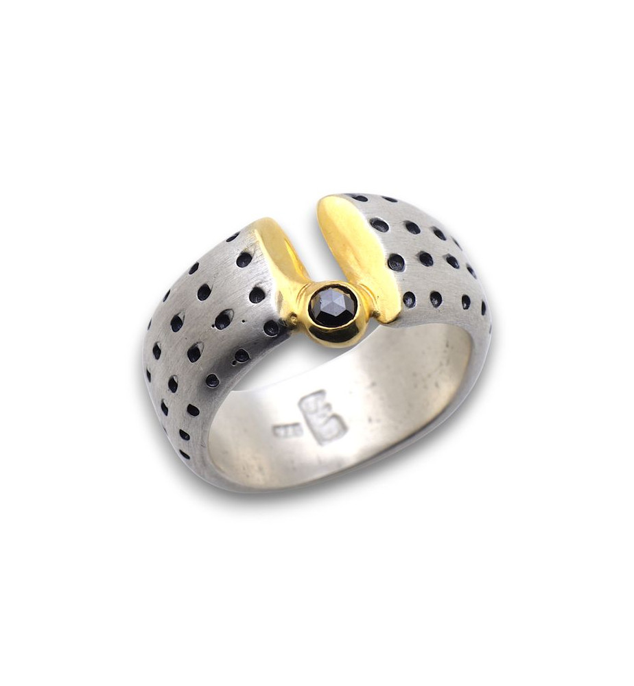 Nous sommes décidément accros aux bijoux dessinés par Eva notre créatrice polonaise et ce nouveau modèle de bague en argent 925 empierrée d'un diamant noir renforce notre passion pour ses créations. Cette bague se distingue par son relief : on trouve des cavités (qui sont oxydées) sur les côtés de l'anneau mais surtout le centre de l'anneau est ouvert, c'est le diamant qui relie chaque partie. Une fine couche d'or apporte une touche de contraste avec la patine des trous et l'argent mat. Comme d'habitude (vous le savez si comme nous vous êtes adeptes des bijoux d'Eva) de minuscules imperfections peuvent être présentes sur l'anneau, ce qui à nos yeux ajoute du charme à la bague. La largeur de l'anneau varie de 7 mm à 1 cm, 1,2 cm au niveau du diamant. D'autre part il est indéformable puisqu'il fait 2 mm d'épaisseur.