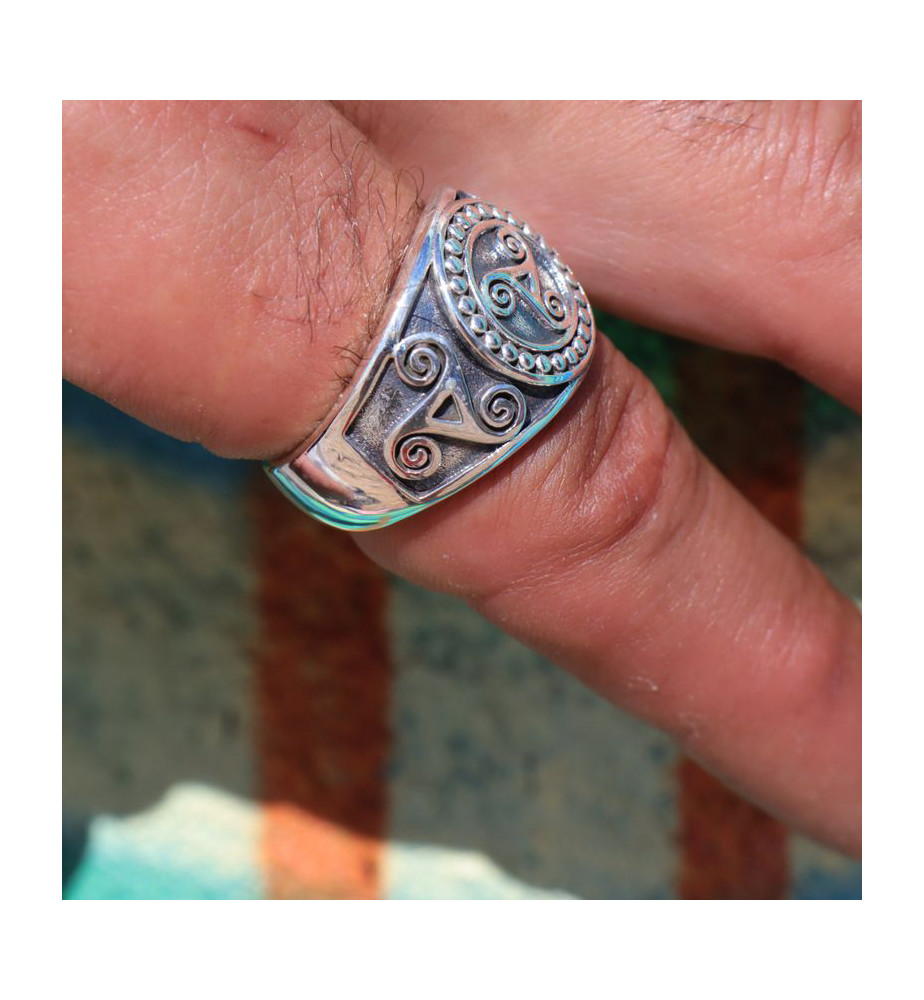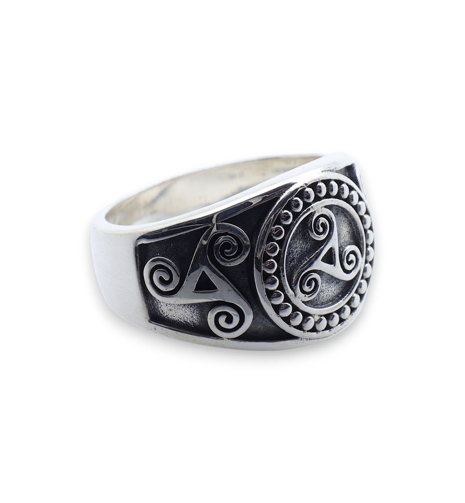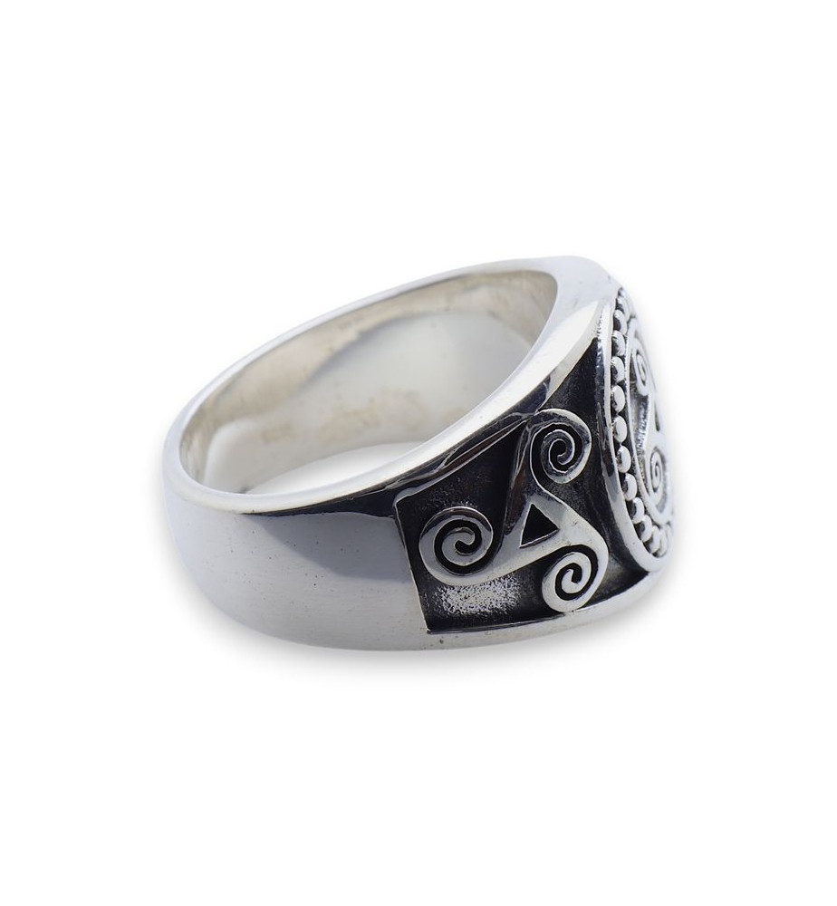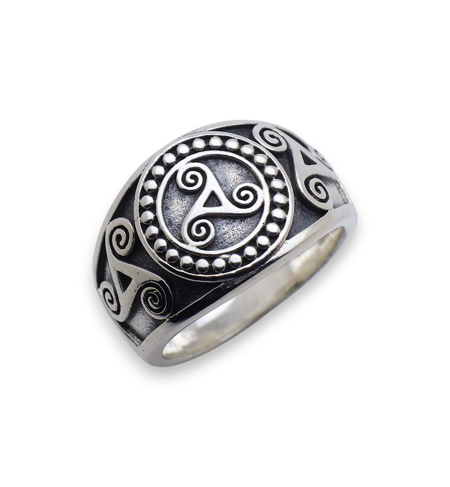 Cette bague chevalière en argent 925 est décorée de trois triskèles (ou triskells) représentant des spirales entrecroisées (il existe également des triskèles représentant trois jambes humaines). Ce symbole ancestral se rencontre depuis le Néolithique dans différentes cultures et périodes (Malte, Irlande, Grèce) mais caractérise l'art celtique pendant le second âge du fer (du Vè au IIè avant J-C). On trouve différentes significations selon les sources. Un esprit vintage caractérise cette bague, grâce au contraste entre les motifs argentés en relief et le fond vieilli. La largeur de l'anneau varie de 0.6 à 1.6 cm.