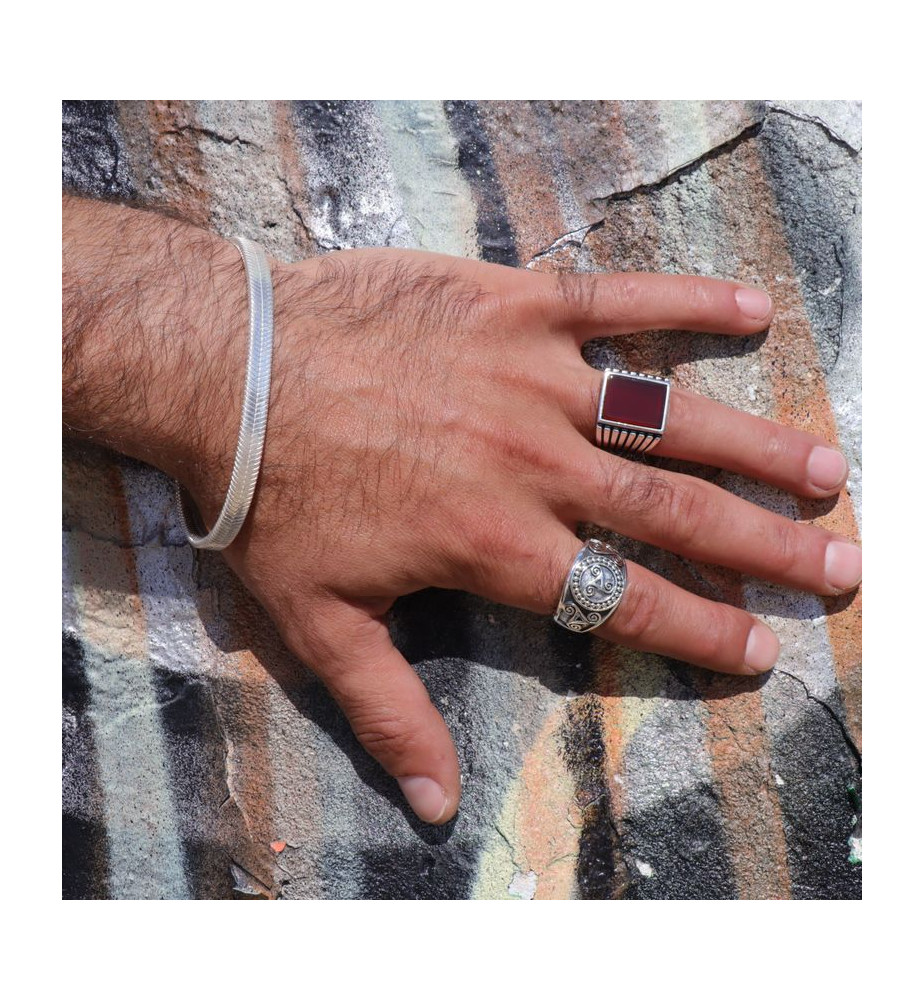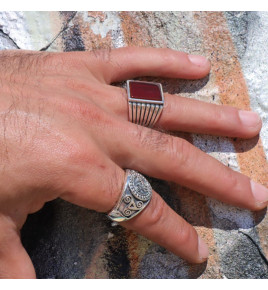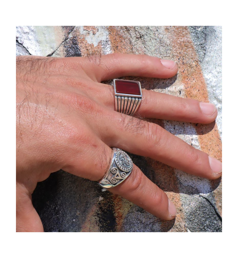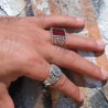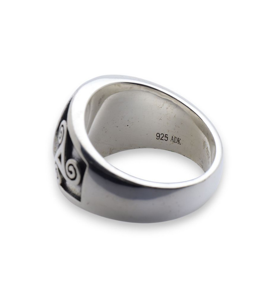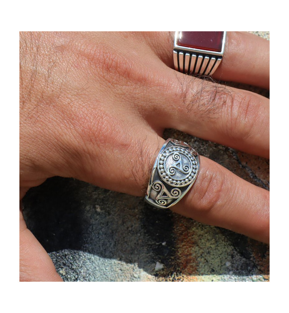 Cette bague chevalière en argent 925 est décorée de trois triskèles (ou triskells) représentant des spirales entrecroisées (il existe également des triskèles représentant trois jambes humaines). Ce symbole ancestral se rencontre depuis le Néolithique dans différentes cultures et périodes (Malte, Irlande, Grèce) mais caractérise l'art celtique pendant le second âge du fer (du Vè au IIè avant J-C). On trouve différentes significations selon les sources. Un esprit vintage caractérise cette bague, grâce au contraste entre les motifs argentés en relief et le fond vieilli. La largeur de l'anneau varie de 0.6 à 1.6 cm.