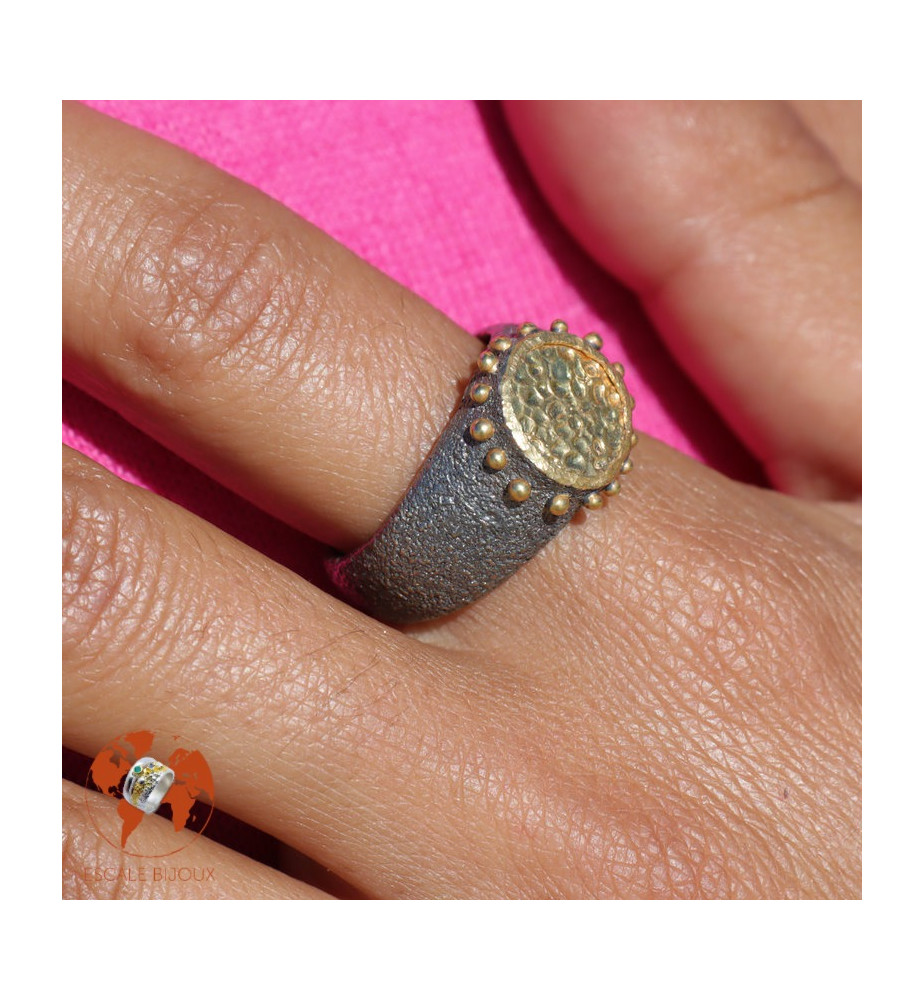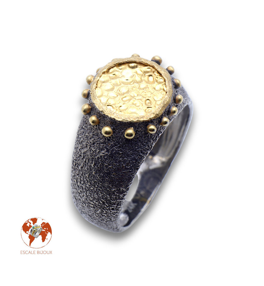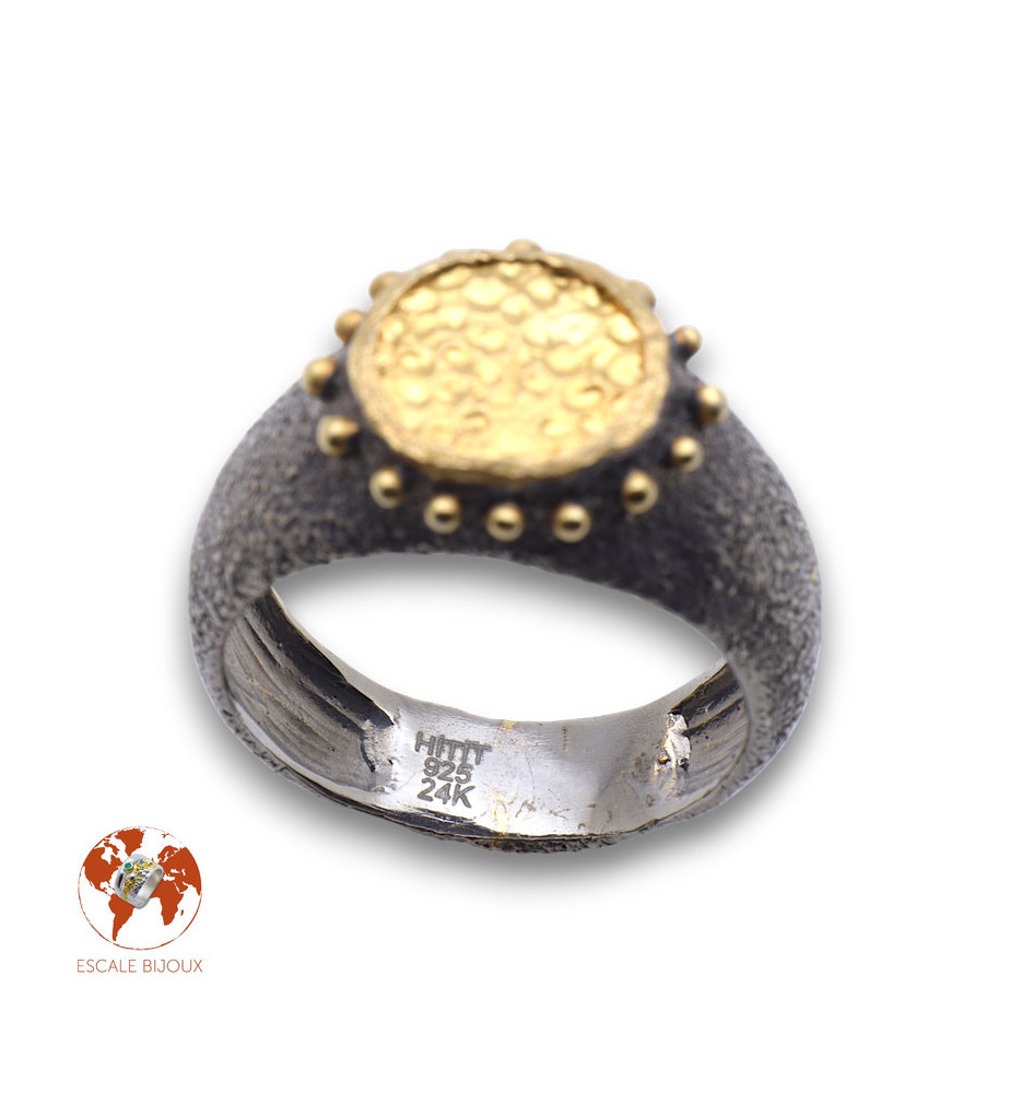 Cette nouvelle bague conçue par notre créateur turc se marie à merveille avec celle-ci, et pour peu que les tailles soient les bonnes les deux peuvent être portées par les deux membres d'un couple. On retrouve les mêmes caractéristiques que pour la bague toi et moi : un anneau texturé en argent 925 rhodié ; le haut de la bague est rond, martelé et recouvert d'une épaisse couche d'or 24 carats (environ 25 microns). L'artisan bijoutier a également recouvert les picots d'or 24 carats. La partie ronde mesure 1.15 de diamètre (sans les picots). Cette bague se porte autant au féminin qu'au masculin et est très facile à assortir à d'autres bijoux.