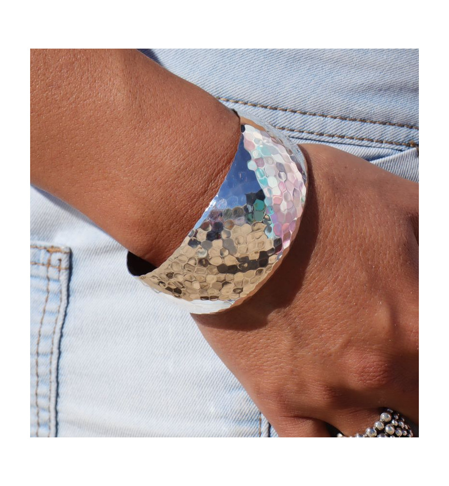 Cette superbe manchette en argent 925, difficile à photographier car elle est très brillante, est martelée et très élégante. L'aspect martelé la rend beaucoup moins fragile qu'un bracelet en argent poli, bien sûr il faut faire attention aux traces de doigt mais comme la plupart de nos bijoux il sera livré avec un carré de chiffonnette pour nettoyer l'argent. Vous pourrez bien sûr porter cette manchette avec n'importe quel style vestimentaire et lui associer de nombreux bijoux. Sans être légère (31.2 gr) elle est très confortable et on ne la sent pas du tout.