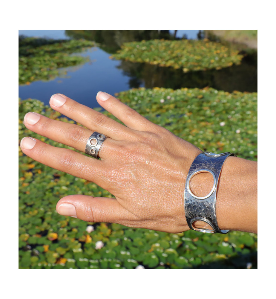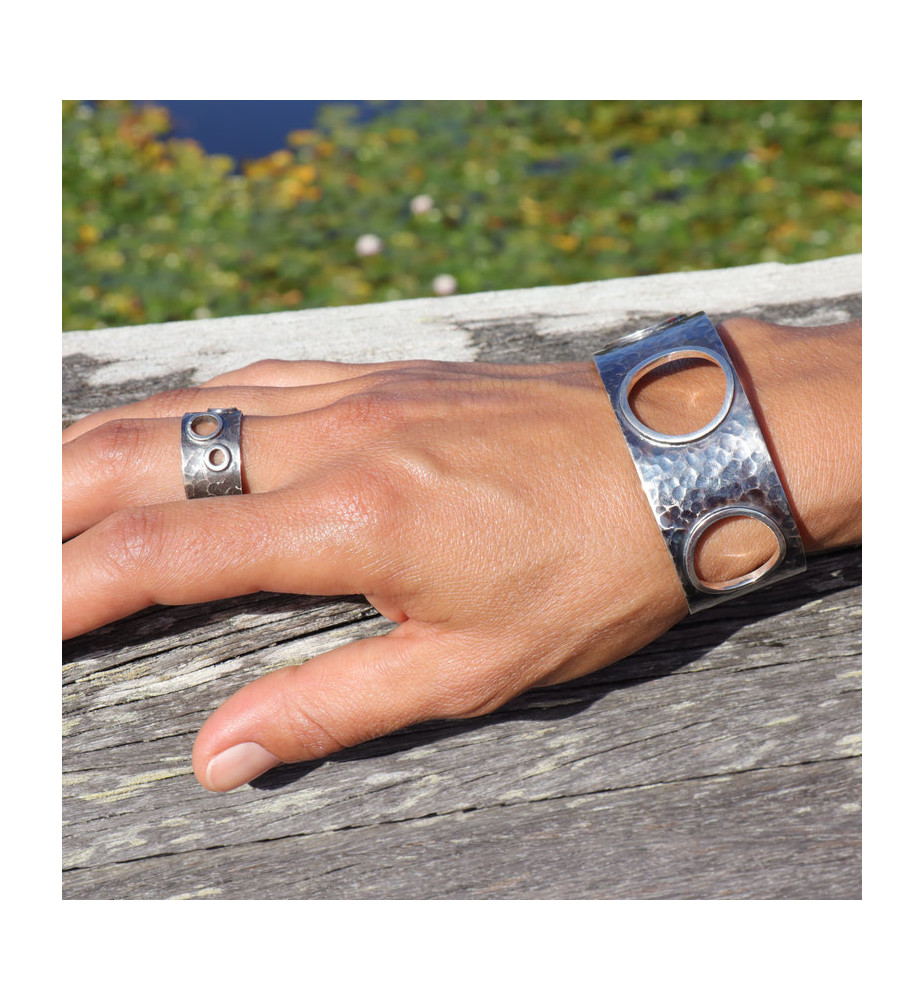 Cette manchette en argent 925 convient à toutes les dimensions de poignets car elle est facile à resserrer ou élargir. L'argent est martelé et l'extérieur de la manchette a été vieilli, tandis que l'intérieur est blanc. Trois grands cercles évidés apportent légèreté et fantaisie au bracelet. Leurs bords sont blancs, créant ainsi un contraste avec le reste de la manchette. Agréable à porter et facile à assortir avec des bagues tout argent ou serties d'une pierre, ce bijou vous suivra partout.
