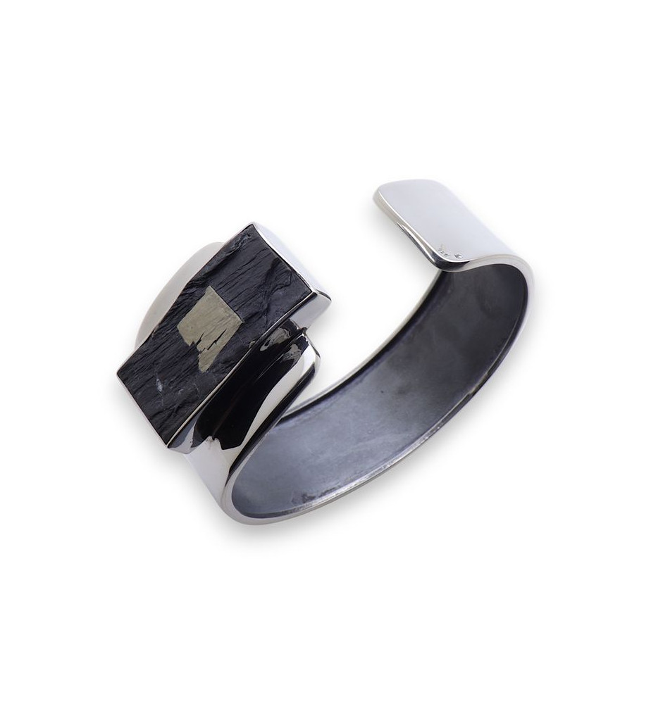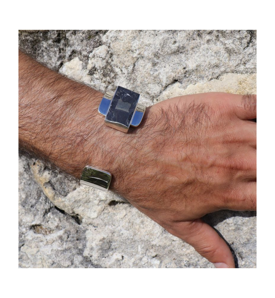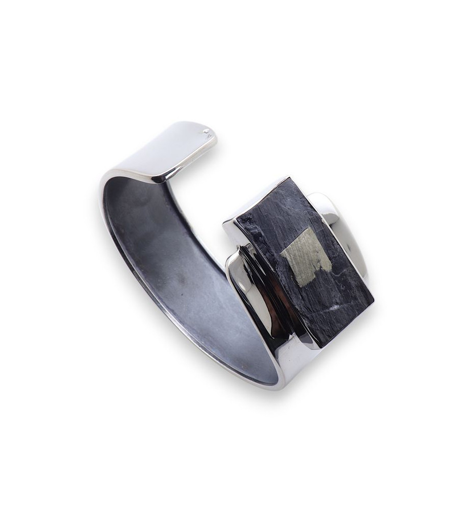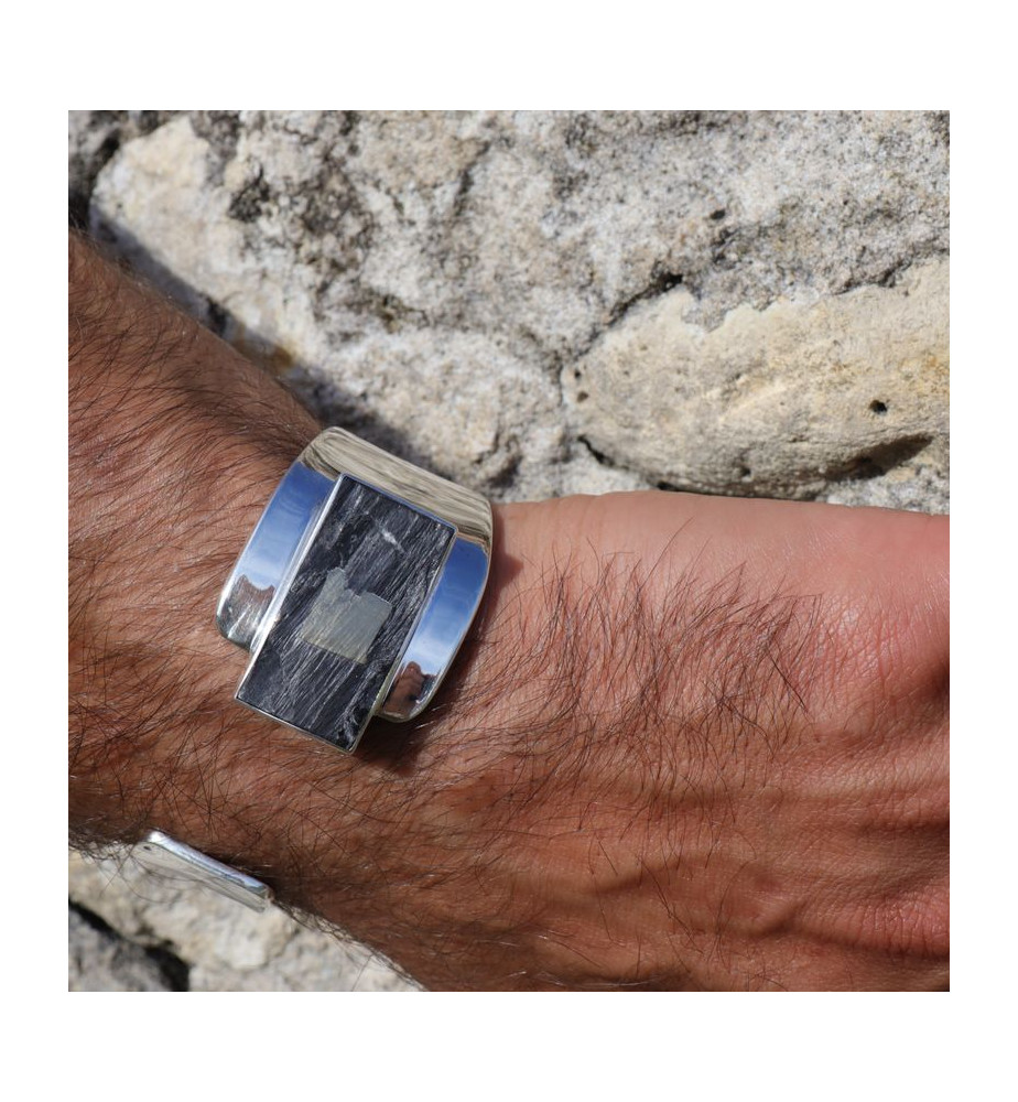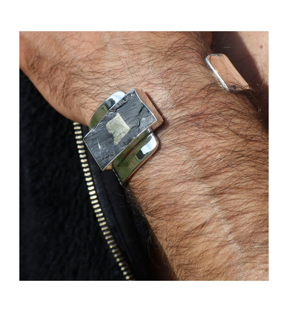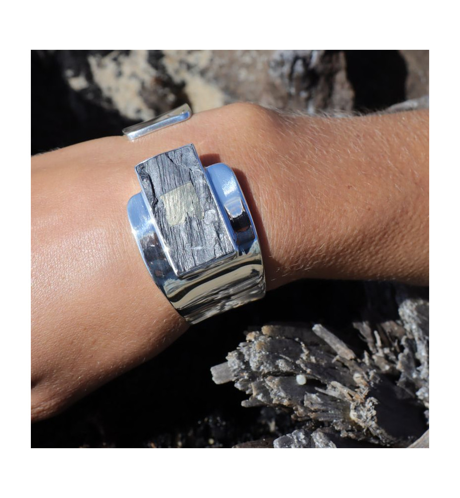Cette superbe manchette en argent 925 est empierrée d'une pyrite sur ardoise. Elle convient autant aux hommes qu'aux femmes, toutefois nous ne la conseillons pas pour les poignets excessivement petits ou forts. Elle est bien sûr réglable mais l'ouvrir trop nuirait à l'esthétisme du bracelet. L'ouverture pour le poignet est actuellement de 2.5 cm, 3.5 cm nous semble le maximum. L'ardoise comporte une seule inclusion de pyrite placée au centre ; deux des côtés de la pyrite sont droits tandis que les deux autres sont irréguliers, ce qui apporte une note contrastée. L'ardoise et sa monture mesurent 3.38 x 1.78 cm. Le bracelet fait 3.2 cm de largeur au plus large (autour de l'ardoise) et 2.1 à l'extrémité la plus fine. Superbe bijou à porter seul ou en parure avec le pendentif assorti (et la bague pour les femmes) ou tout simplement avec une chaîne argent, ce bracelet vous accompagnera dans toutes les circonstances, sauf pour la plage (le sable raierait l'argent et la surface à rayer est imposante sur ce bijou). D'autre part son design contemporain le rend facile à associer à tous les styles vestimentaires.