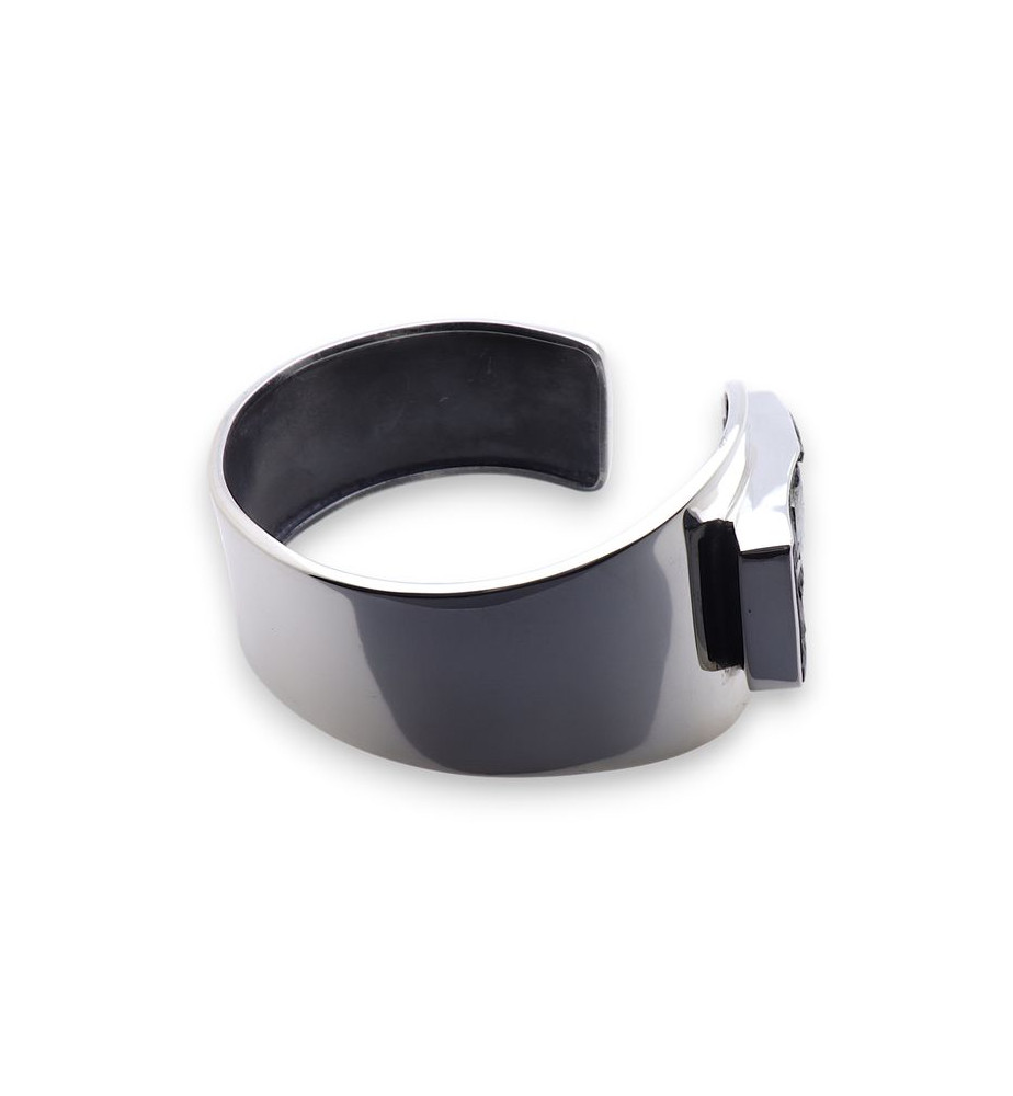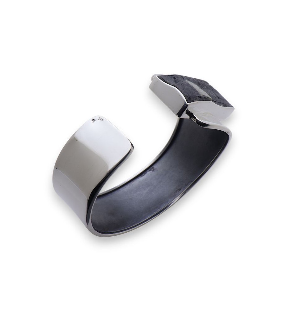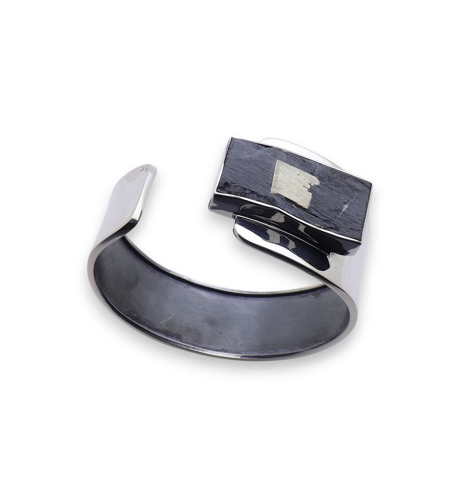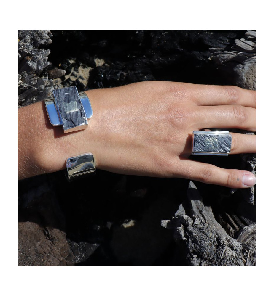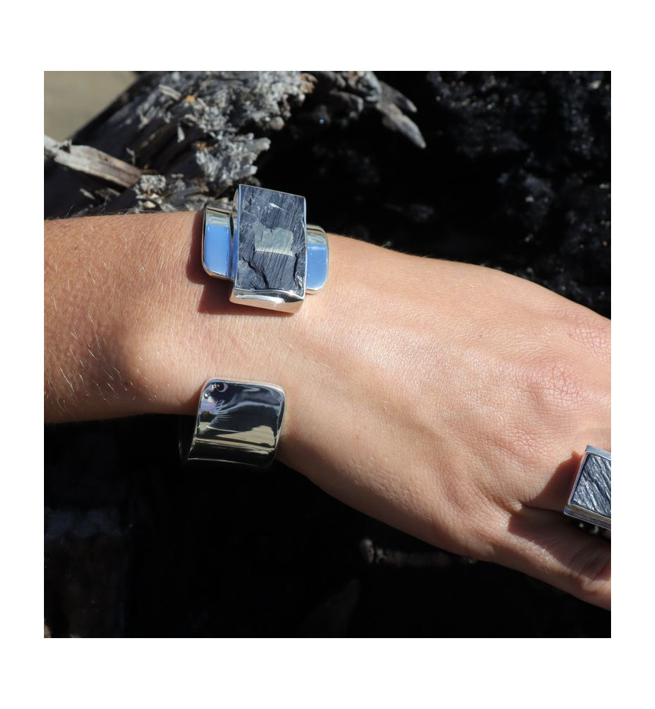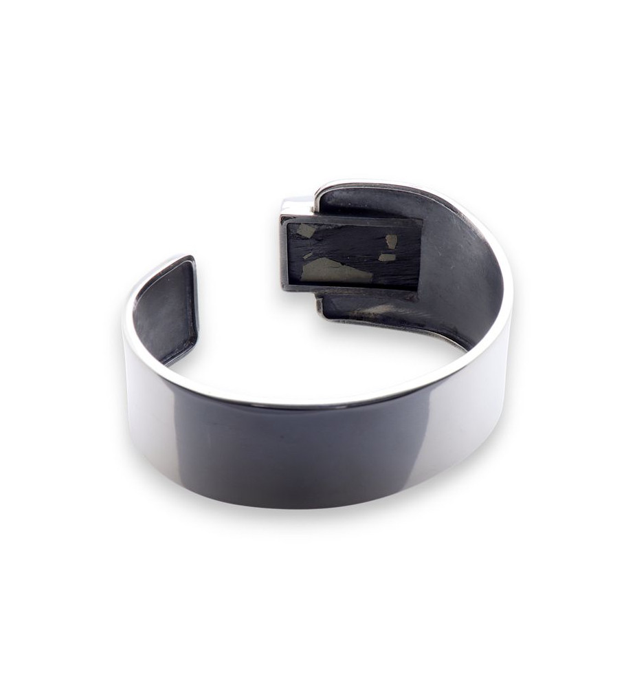 Cette superbe manchette en argent 925 est empierrée d'une pyrite sur ardoise. Elle convient autant aux hommes qu'aux femmes, toutefois nous ne la conseillons pas pour les poignets excessivement petits ou forts. Elle est bien sûr réglable mais l'ouvrir trop nuirait à l'esthétisme du bracelet. L'ouverture pour le poignet est actuellement de 2.5 cm, 3.5 cm nous semble le maximum. L'ardoise comporte une seule inclusion de pyrite placée au centre ; deux des côtés de la pyrite sont droits tandis que les deux autres sont irréguliers, ce qui apporte une note contrastée. L'ardoise et sa monture mesurent 3.38 x 1.78 cm. Le bracelet fait 3.2 cm de largeur au plus large (autour de l'ardoise) et 2.1 à l'extrémité la plus fine. Superbe bijou à porter seul ou en parure avec le pendentif assorti (et la bague pour les femmes) ou tout simplement avec une chaîne argent, ce bracelet vous accompagnera dans toutes les circonstances, sauf pour la plage (le sable raierait l'argent et la surface à rayer est imposante sur ce bijou). D'autre part son design contemporain le rend facile à associer à tous les styles vestimentaires.