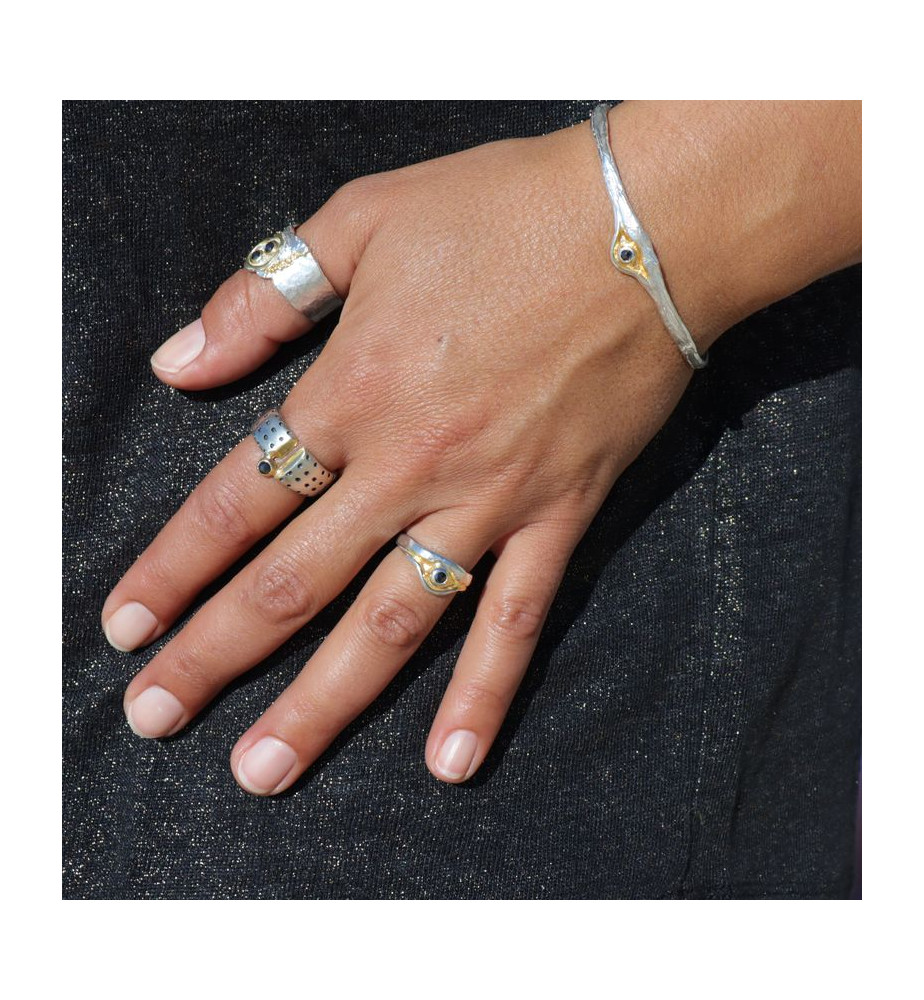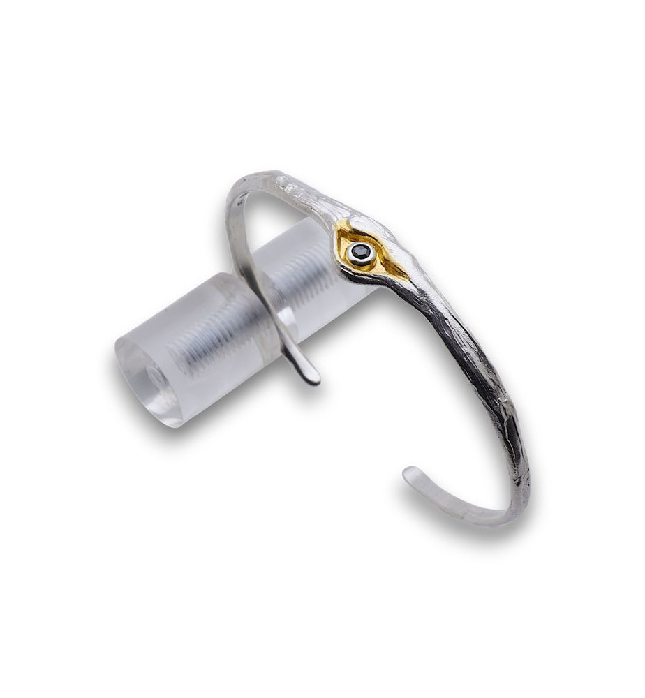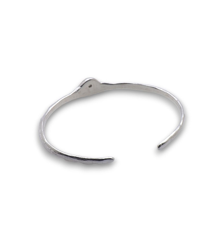 Si comme nous vous êtes fans des bijoux de notre créatrice polonaise Eva vous serez séduite par ce superbe jonc en argent 925 serti d'un diamant noir. L'argent est mat et texturé, les contours du jonc sont irréguliers, toutes ces caractéristiques étant la marque de fabrique d'Eva. Le diamant noir est niché dans son écrin doré (fine couche d'or) au centre du jonc et le blanc mat de l'argent le sublime. Le jonc fait 3 mm de large aux extrémités et s'élargit jusqu'à 5 mm juste avant "l'oeil", au niveau duquel on atteint 1 cm. Nous vous donnons la dimension intérieure ainsi que l'ouverture actuelle pour le passage du poignet (dans l'onglet Détails du produit) à titre indicatif car bien sûr ce jonc est réglable ; il est cependant prévu pour un poignet fin à moyen.