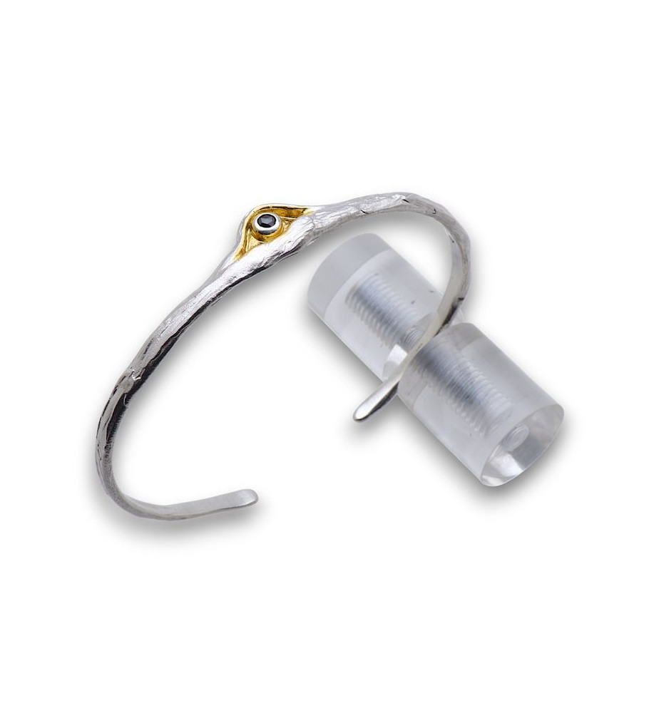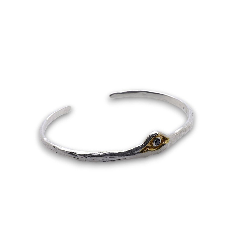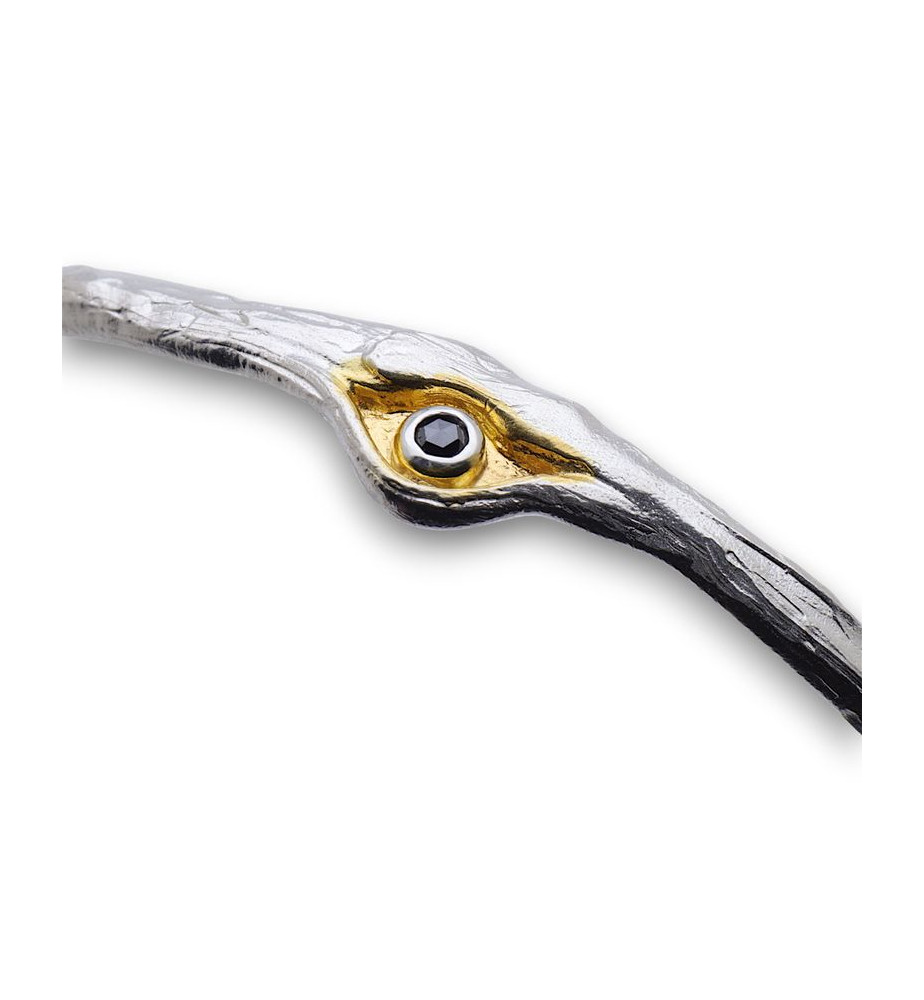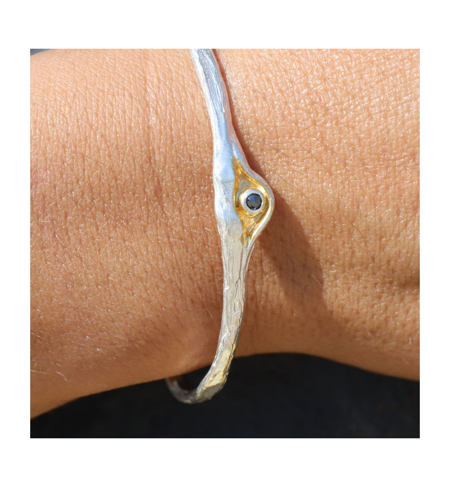 Si comme nous vous êtes fans des bijoux de notre créatrice polonaise Eva vous serez séduite par ce superbe jonc en argent 925 serti d'un diamant noir. L'argent est mat et texturé, les contours du jonc sont irréguliers, toutes ces caractéristiques étant la marque de fabrique d'Eva. Le diamant noir est niché dans son écrin doré (fine couche d'or) au centre du jonc et le blanc mat de l'argent le sublime. Le jonc fait 3 mm de large aux extrémités et s'élargit jusqu'à 5 mm juste avant "l'oeil", au niveau duquel on atteint 1 cm. Nous vous donnons la dimension intérieure ainsi que l'ouverture actuelle pour le passage du poignet (dans l'onglet Détails du produit) à titre indicatif car bien sûr ce jonc est réglable ; il est cependant prévu pour un poignet fin à moyen.