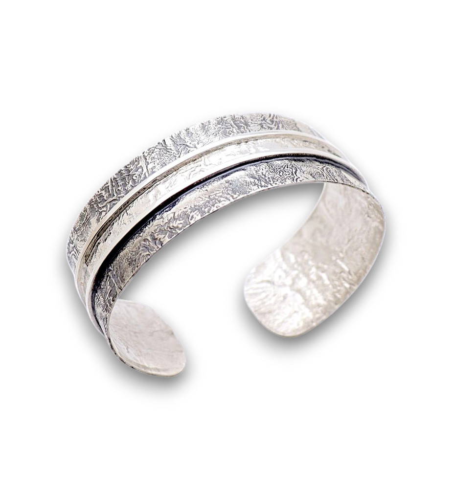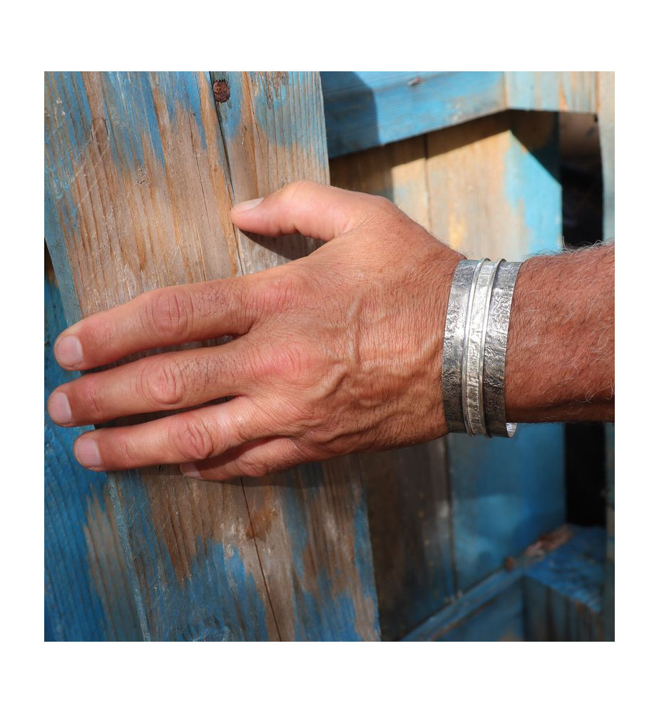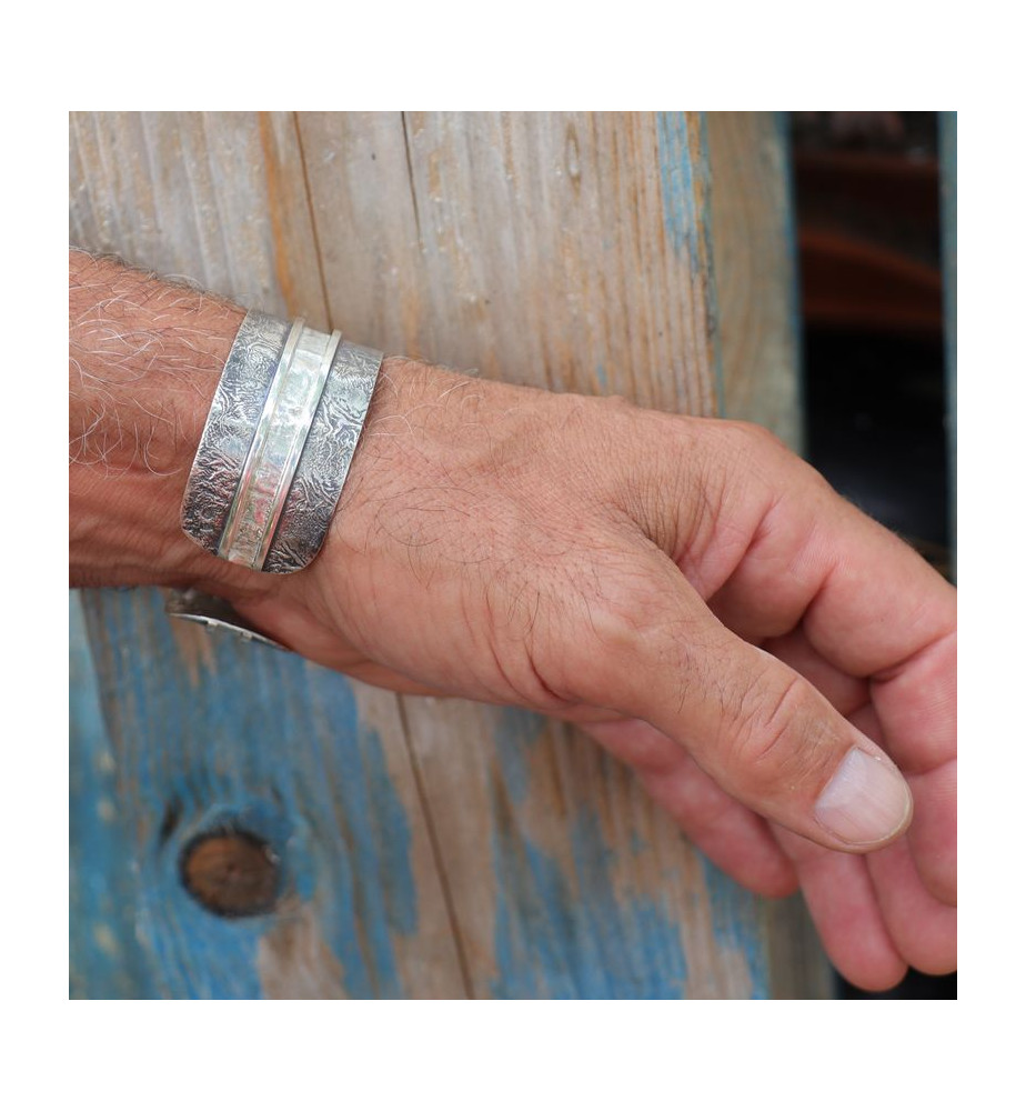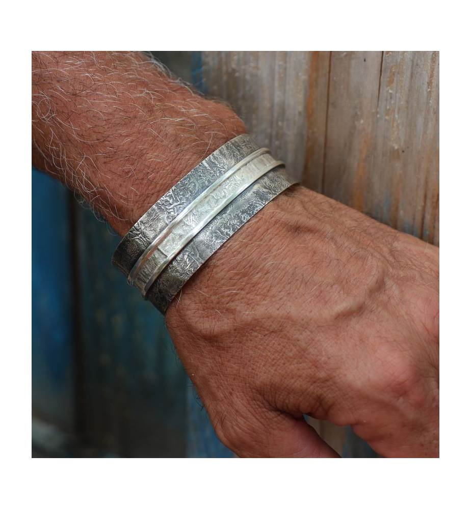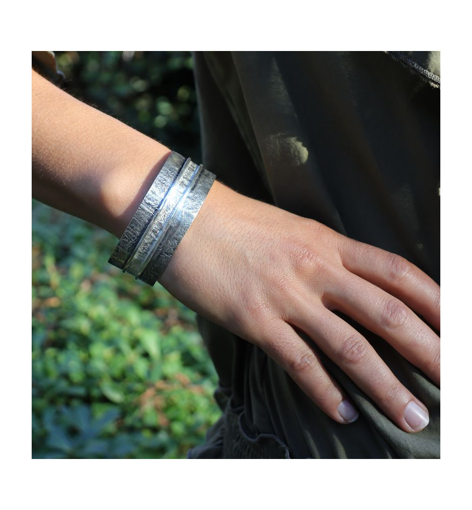 Ce bracelet manchette en argent massif habillera le poignet d'un homme avec élégance et originalité. Il convient bien sûr aussi à une femme à condition qu'elle ait un poignet fort (cf. les dimensions dans l'onglet Détails du produit) ; en effet bien qu'il soit ajustable il n'est pas possible de le resserrer suffisamment pour un poignet fin. Nous retrouvons l'argent texturé de la même façon que sur le pendentif auquel il est associé. En revanche ici l'argent qui est entre les deux tiges d'argent blanc et poli est texturé mais pas oxydé. Bijou issu de l'atelier d'une de nos créatrices polonaises, ce large bracelet argent très contemporain a un esprit indus qui nous fait craquer.