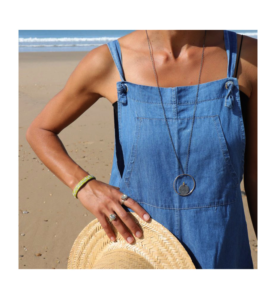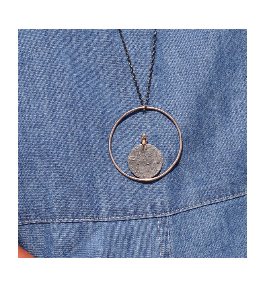 Voici le second collier de notre nouvelle collection le Petit Prince, collier sautoir en argent 925 avec un pendentif qui représente un personnage miniature au bord de la Terre. Il est composé d'une longue chaîne en argent vieilli (elle mesure 83 cm) et d'un pendentif rappelant la fameuse aquarelle du Petit Prince ; ici le personnage est féminin, en tout cas il porte une robe. Le recto de la planète est texturé et oxydé, le personnage est en argent recouvert d'or 14 carats et le grand cercle, l'orbite de la Terre (4.2 cm de diamètre) en argent blanc. Ce sautoir dégage beaucoup de poésie tout en nous faisant voyager dans nos souvenirs de lecture de ce formidable conte. En outre il est un bijou original et moderne, facile à porter. La chaîne est amovible donc rien ne vous empêche de porter le pendentif avec une chaîne plus courte ou même avec un câble.