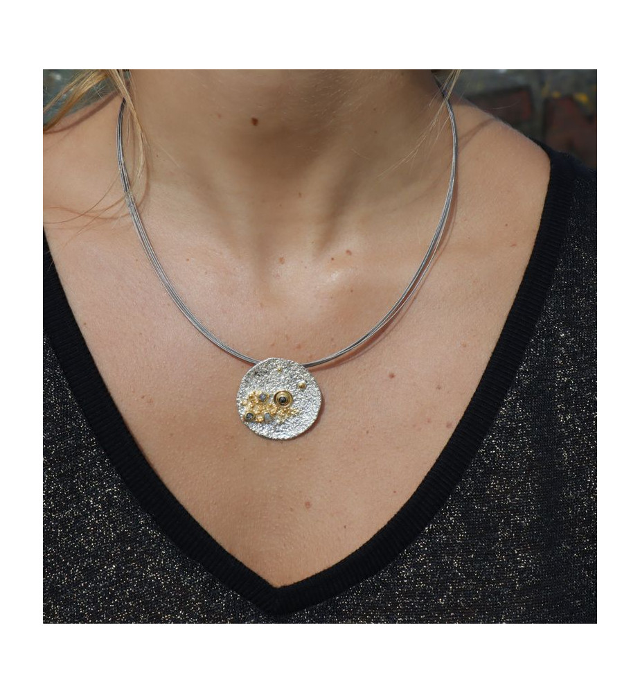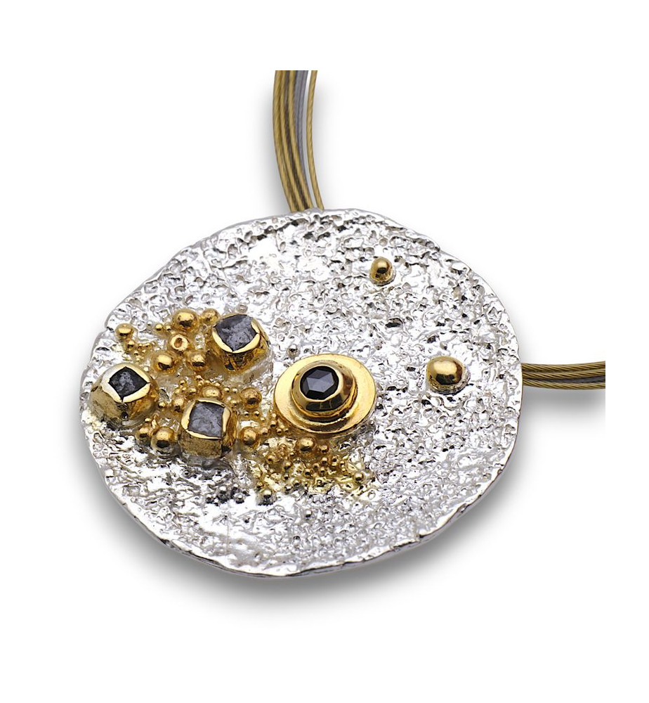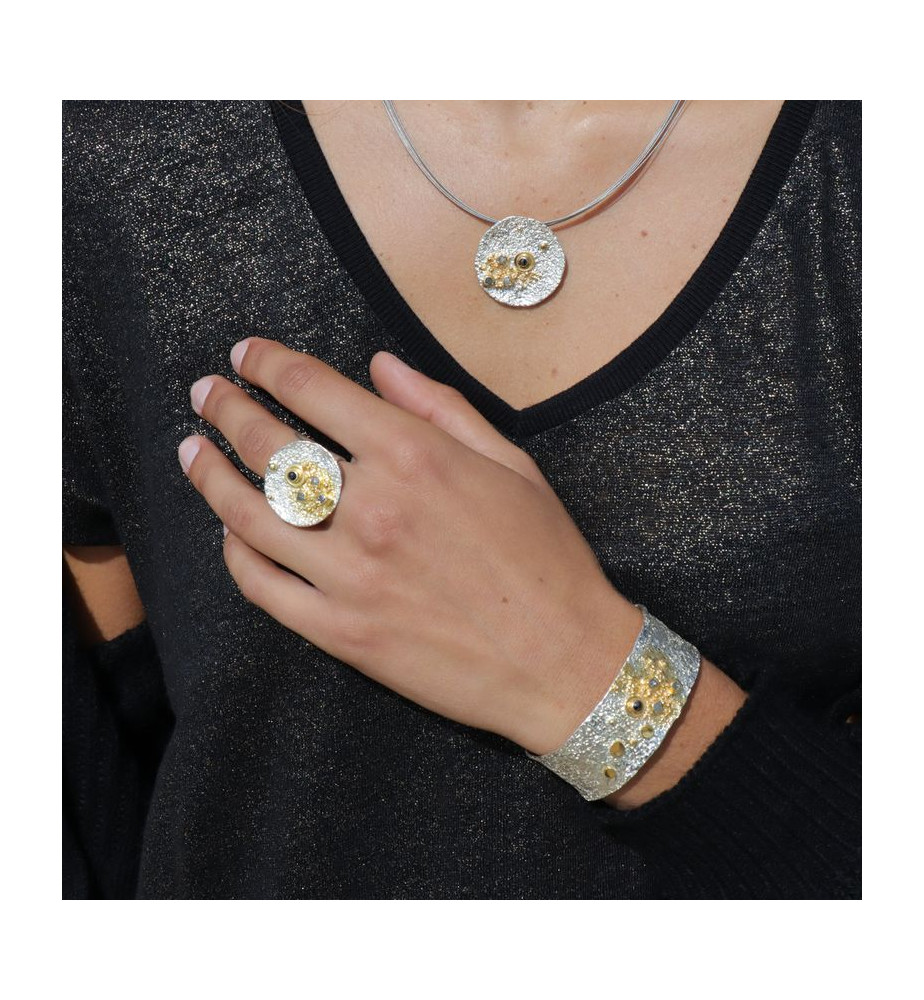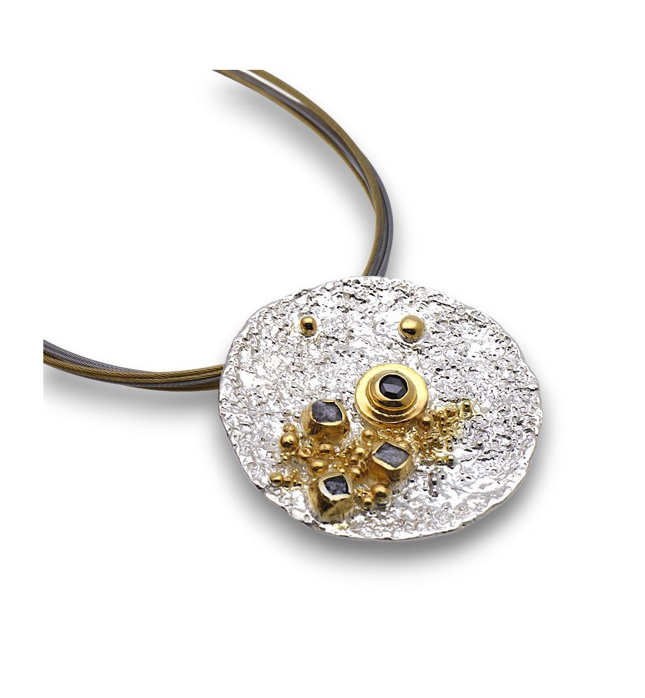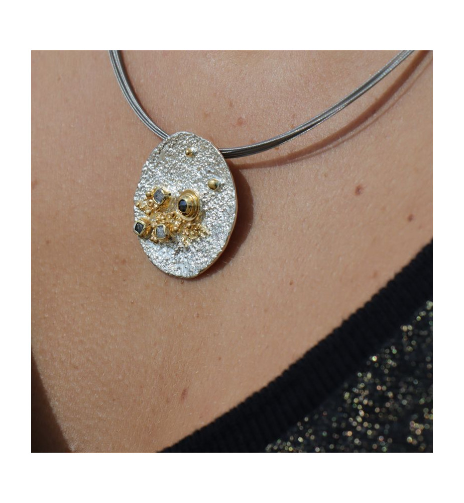 Un bijou serti de diamants mais pas un bijou classique, voici ce que notre bijouterie en ligne vous suggère avec ce nouveau pendentif en argent 925 et diamants créé dans l'atelier d'Eva notre créatrice polonaise. Parfaitement assorti au bracelet proposé ci-dessous, il présente les mêmes caractéristiques : argent texturé, trois diamants bruts et un diamant noir facetté, des bulles d'argent recouvertes d'une fine couche d'or. Seules les pastilles d'argent ne sont pas présentes sur le pendentif. La double bélière est au verso et donc invisible. Vous porterez ce délicat pendentif aussi bien pour une occasion festive particulière que pour aller travailler et il s'accordera avec de nombreux styles de bijoux.